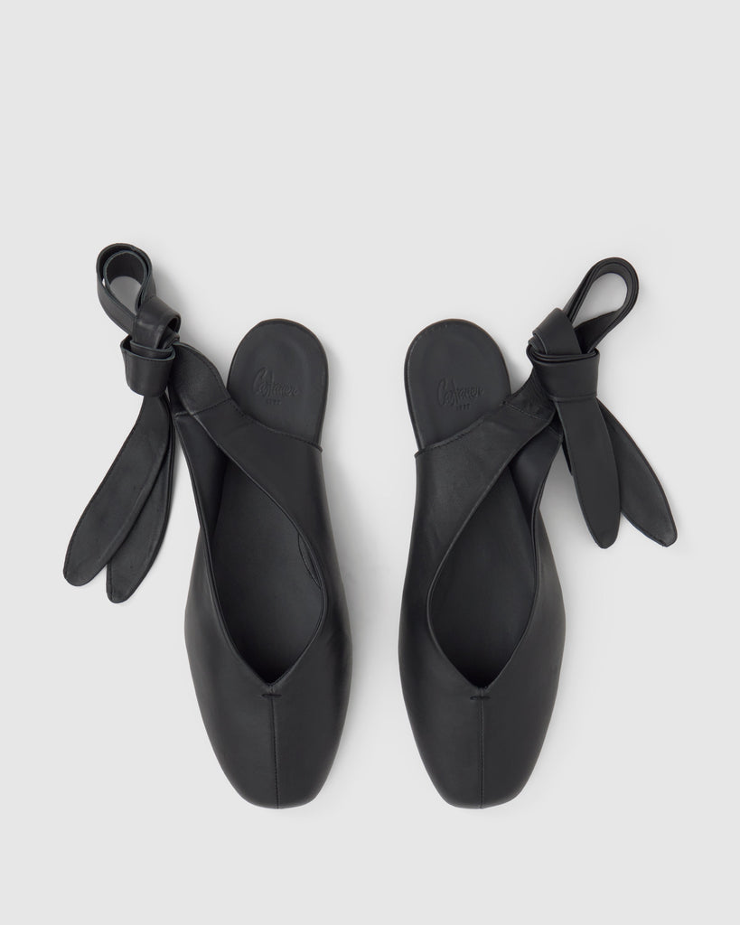 Ada slingback flat with tone-on-tone ribbon closure, padded insole, and cuerolite sole.