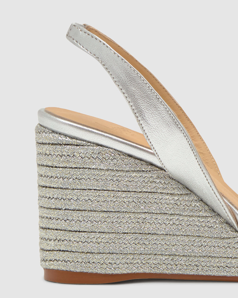 THE BARBY BRAIDED METALLIC SANDALS WILL ELEVATE ANY LOOK. HAND-MADE IN SPAIN, THE BARBY ESPADRILLES ARE A SURE THING. THEY FEATURE AN OPEN TOE, OPEN HEEL, 8 CM WEDGE AND CUEROLITE SOLE.