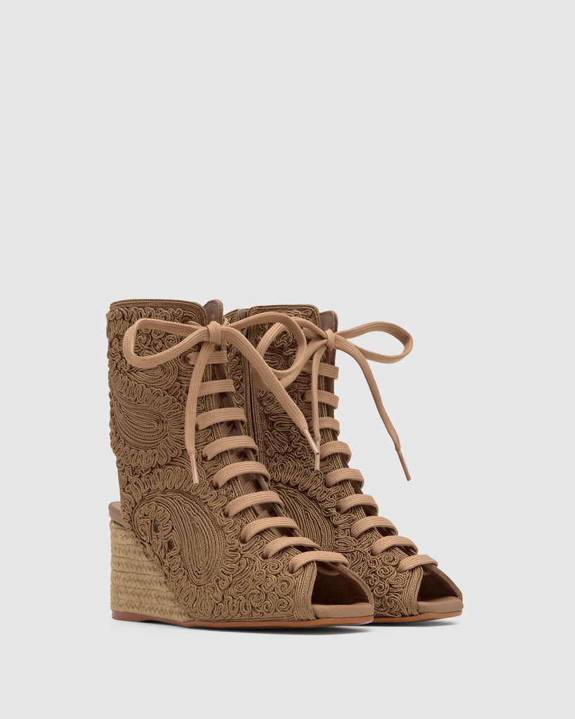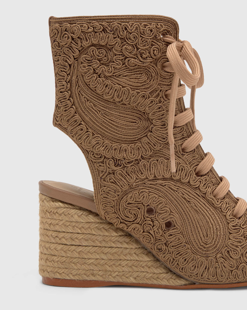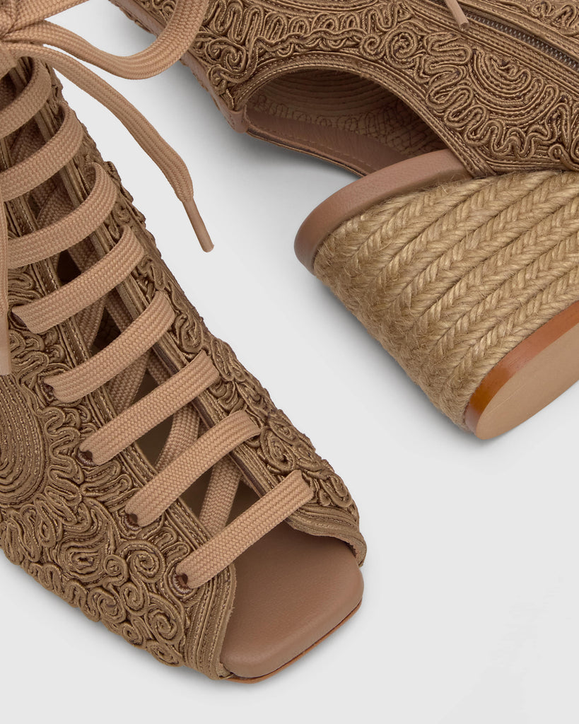 Bertina high-top sandal in rayon cord depicting ETRO's iconic paisley. Zipper closure, padded insole and 8cm taupe jute wedge.