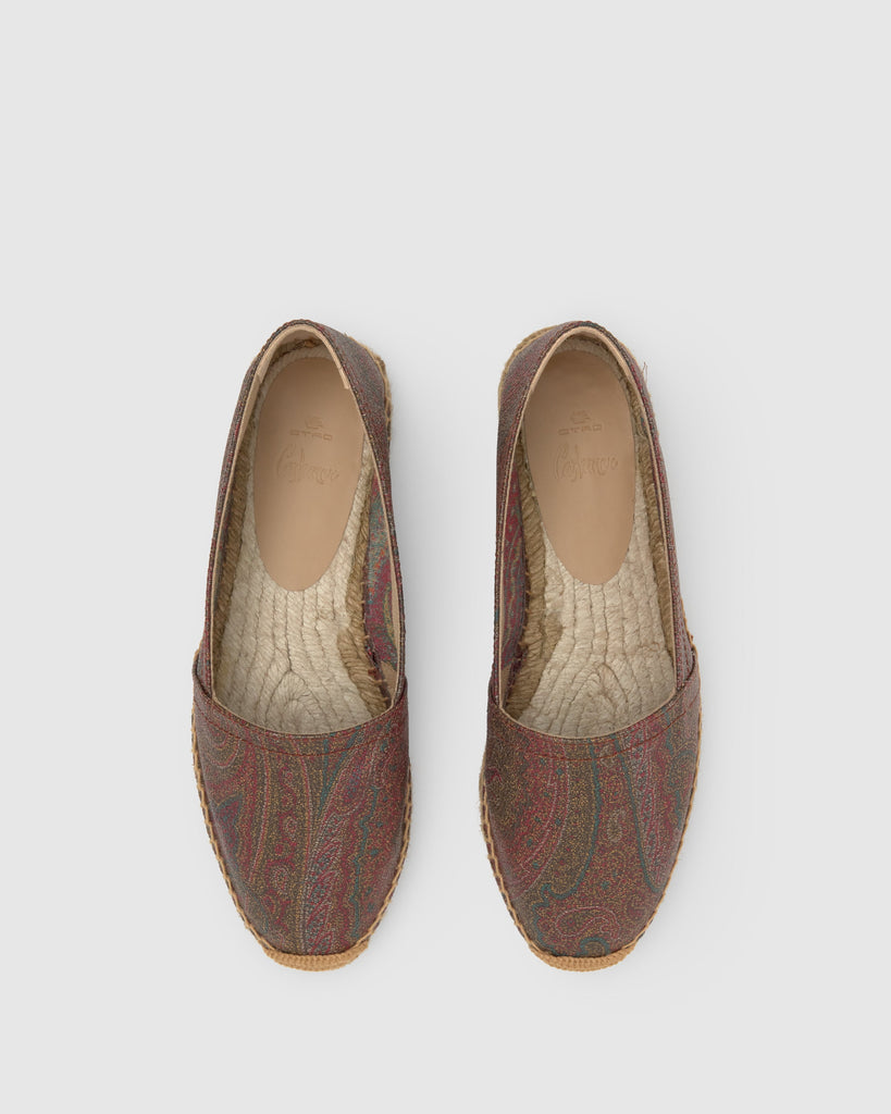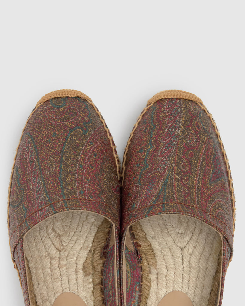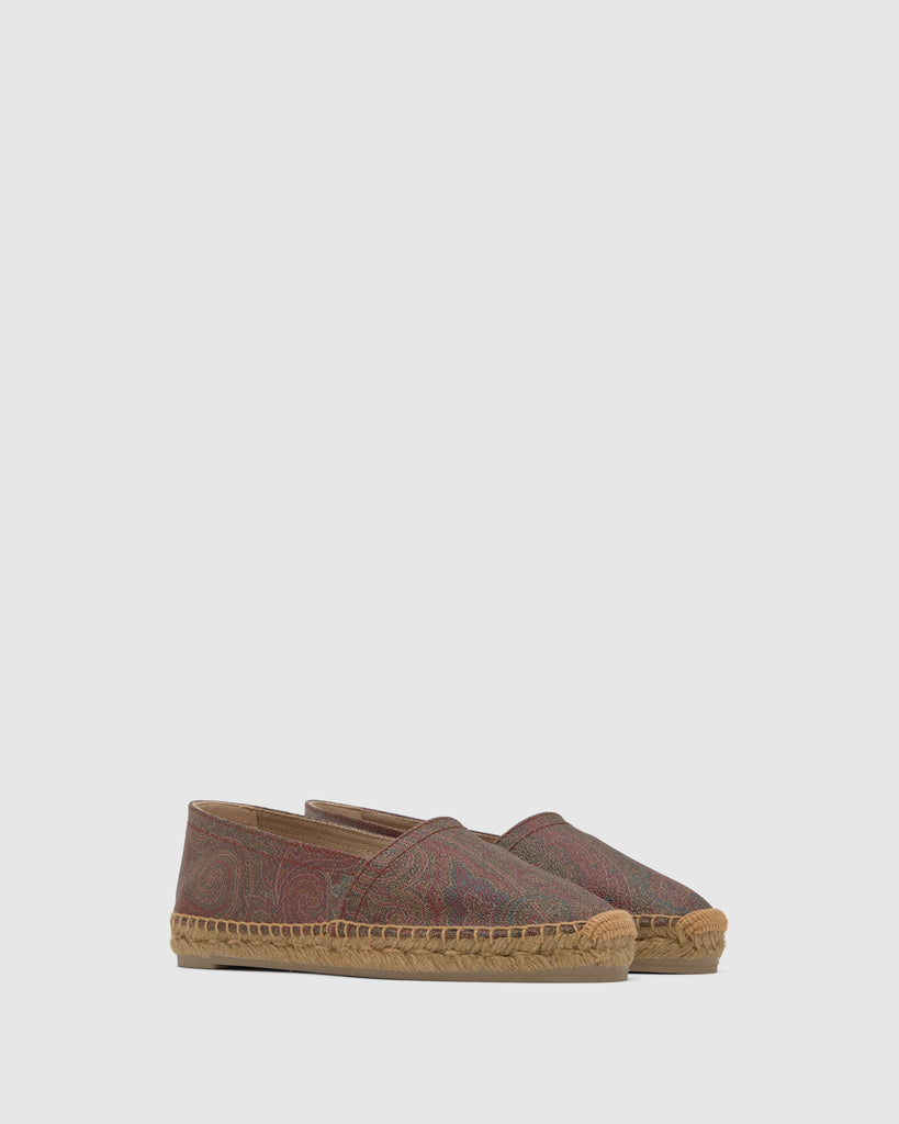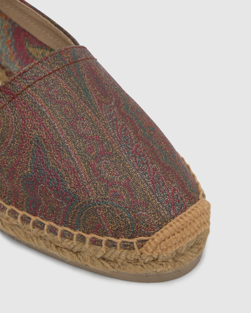Kenda camping style flat espadrille in ETRO's iconic jacquard fabric with a rubberized finish and Castañer's characteristic taupe jute sole.