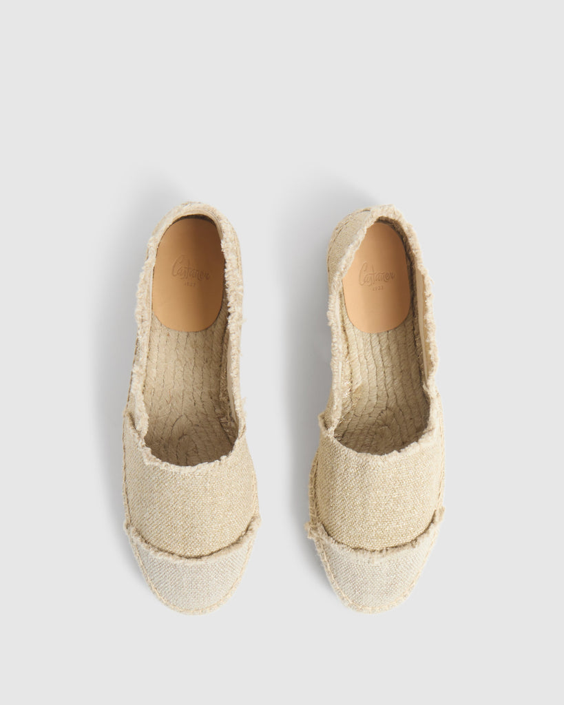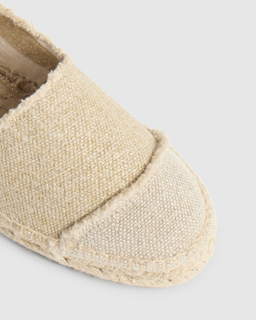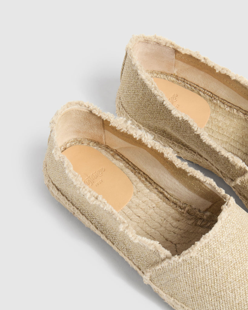 METALLIC COTTON CANVAS ESPADRILLE FLATS. WITH FRAYED FINISH. CONTRASTING ROUND TOE. VULCANISED-RUBBER SOLE IN NATURAL COLOUR AND 2 cm PLATFORM.
