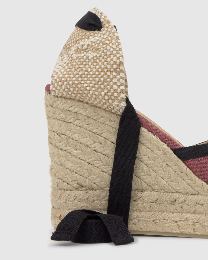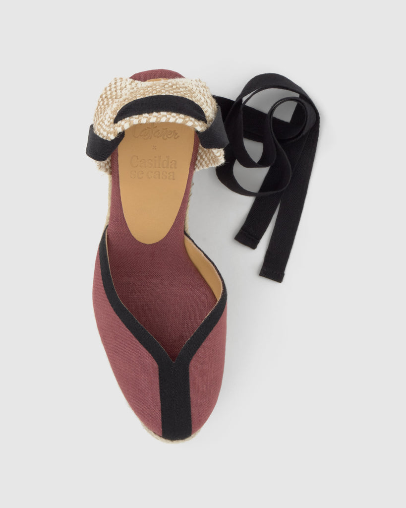 Designed by 'Casilda se Casa' for Castañer, the Carmen espadrille in linen with cotton ribbons is the ideal choice for any celebration. It features ribbon closure, padded insole, and a V-shaped neckline. 11cm jute wedge with double platform.