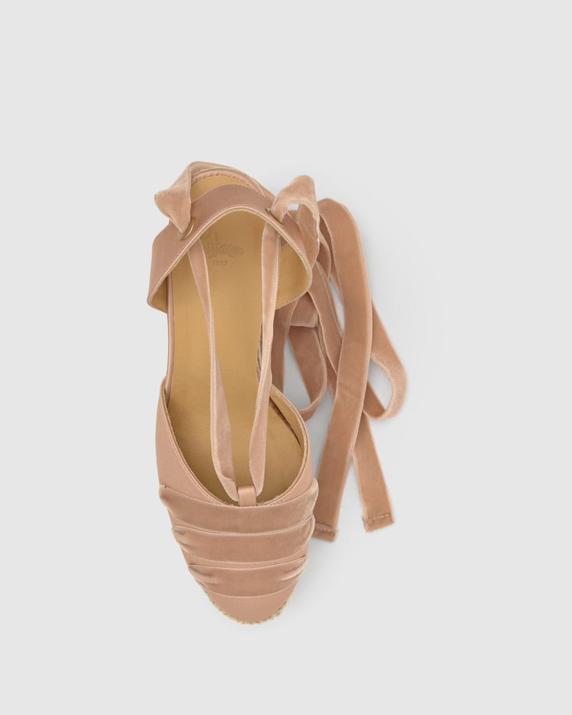 Cersei espadrille in satin with velvet bow closure and cushioned insole. Wedge of 11cm with double platform combined in jute and satin.