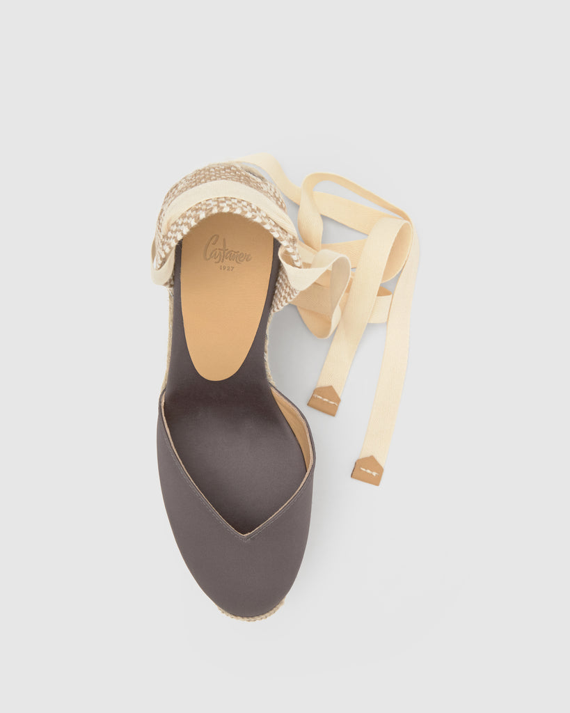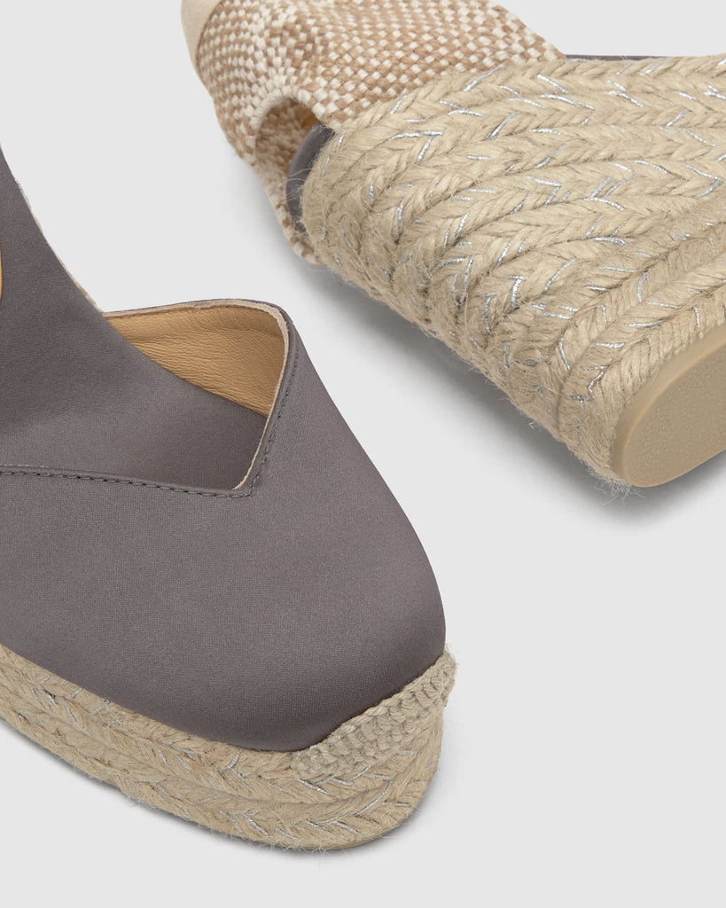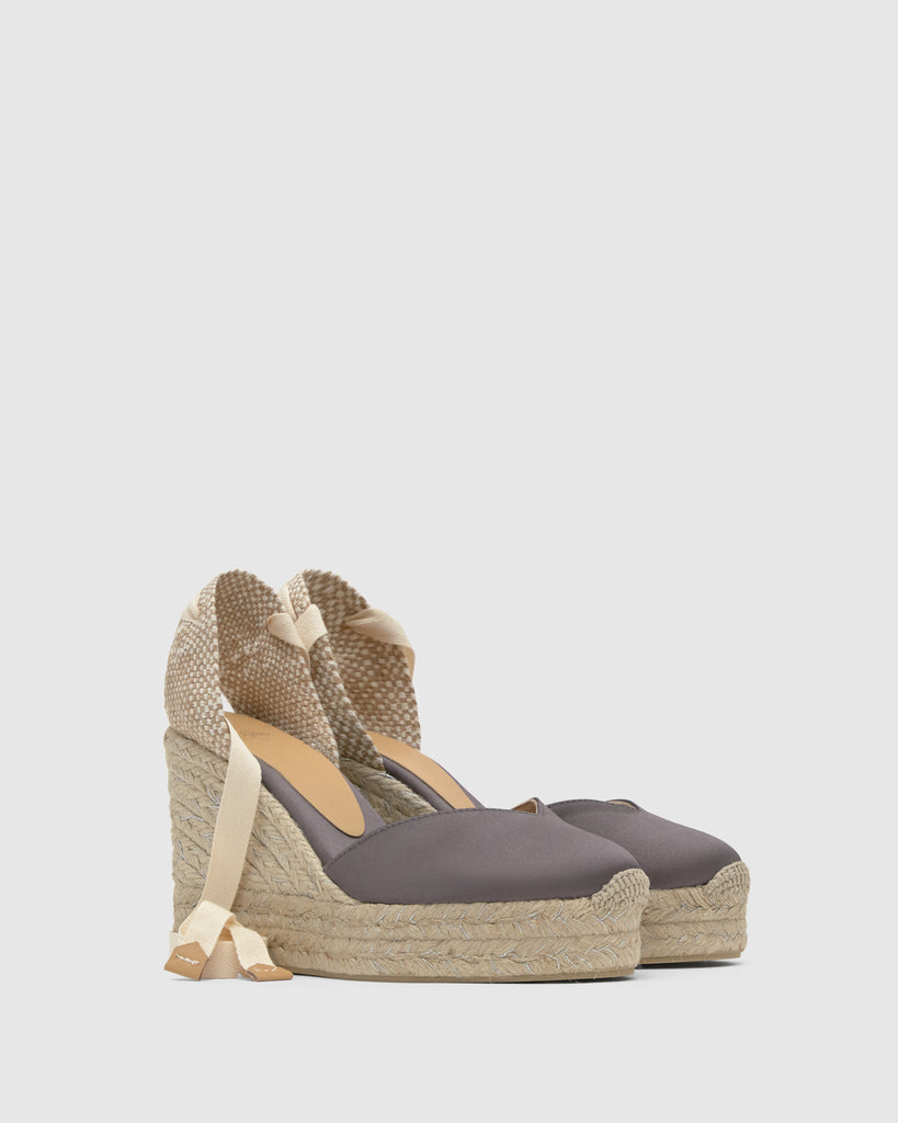 Iconic Chiara espadrille in satin with lace-up closure, cushioned insole and V-neck. Jute wedge of 11cm with double platform.