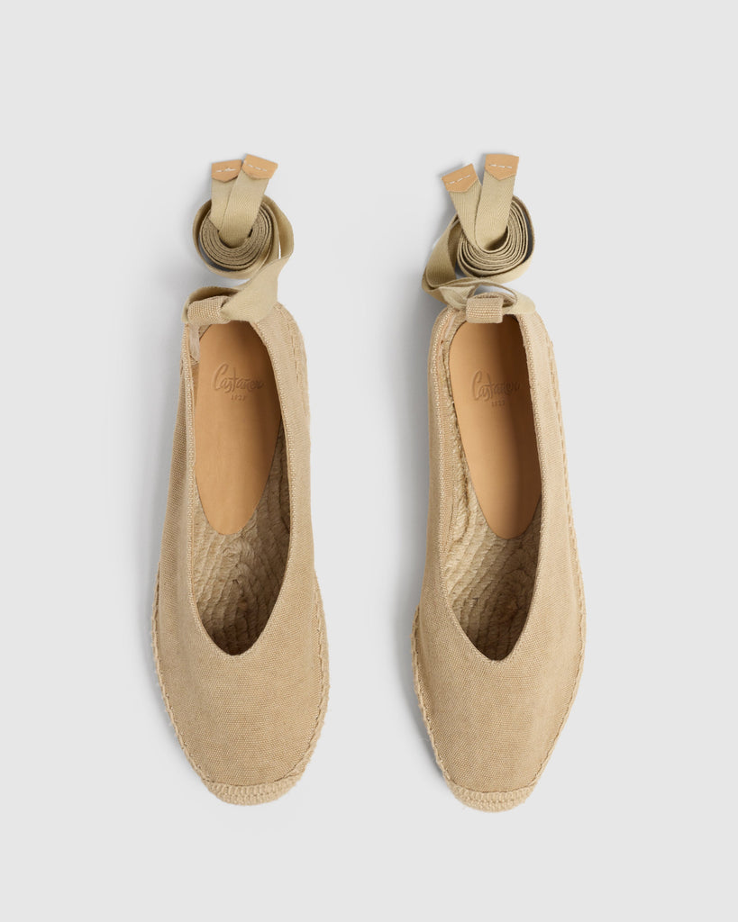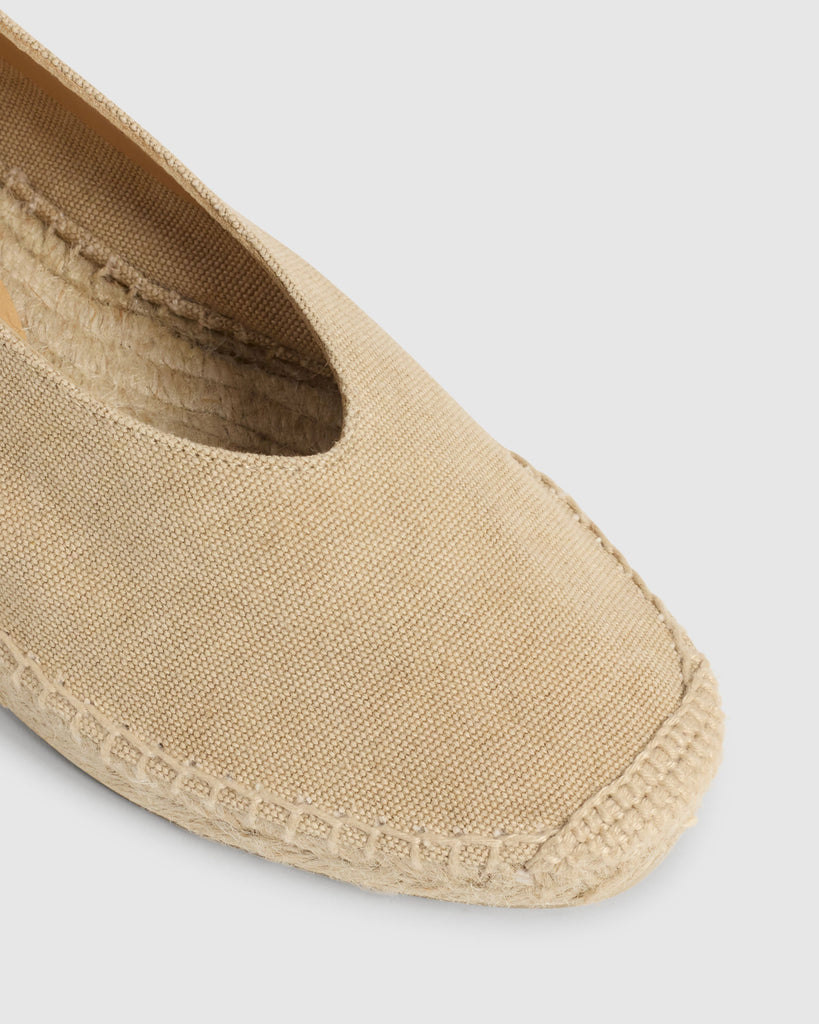 WEDGE BALLET ESPADRILLE MADE OF COTTON CANVAS. V SHAPE CUT AND ANKLE STRIPS. ROUNDED TIP. VULCANIZED SOLE OF JUTE NATURAL COLOUR AND RUBBER. SOLE OF 2cm