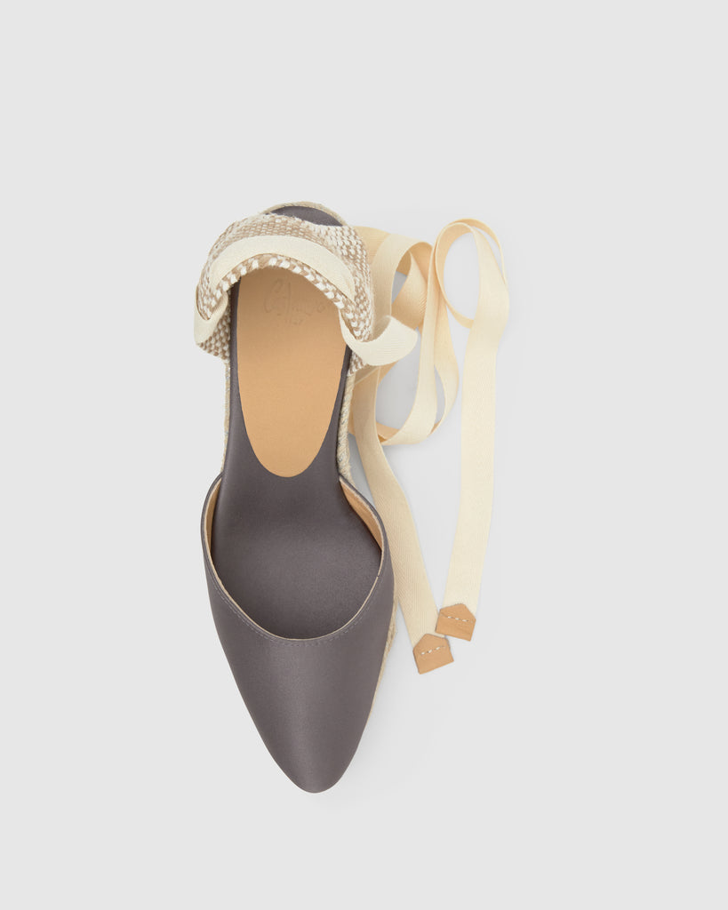 Iconic Joyce espadrille in satin with lace up closing, cushioned insole and pointed toe. Jute wedge of 9cm.