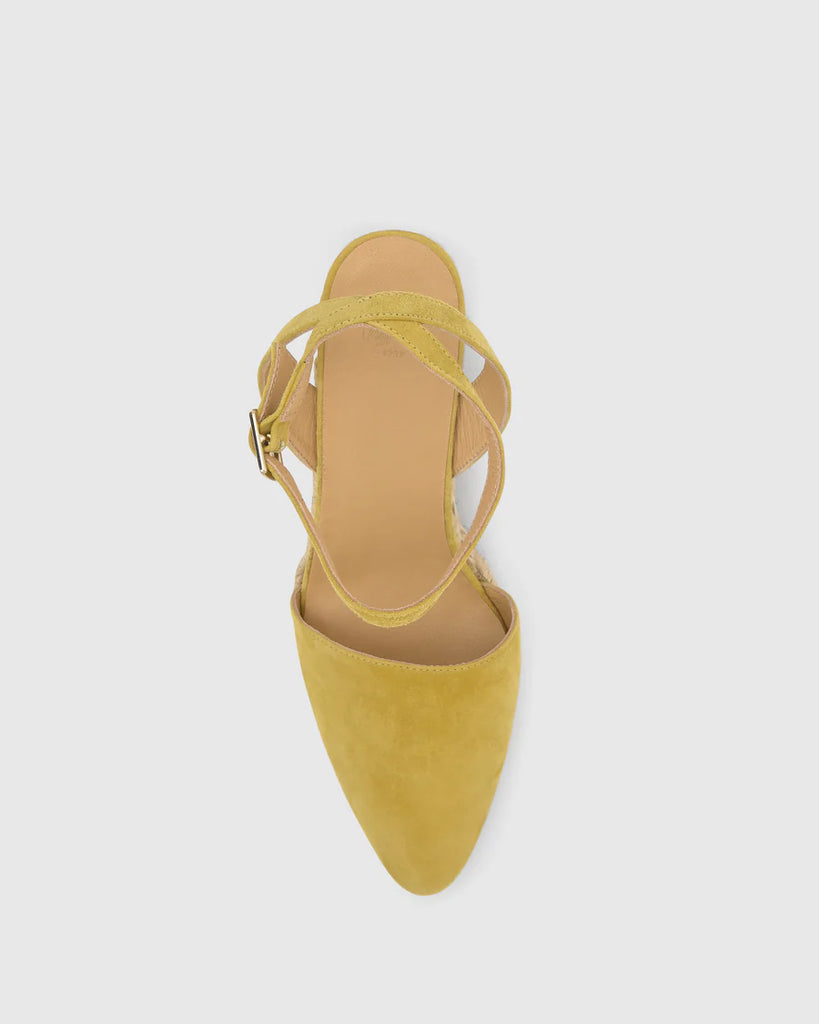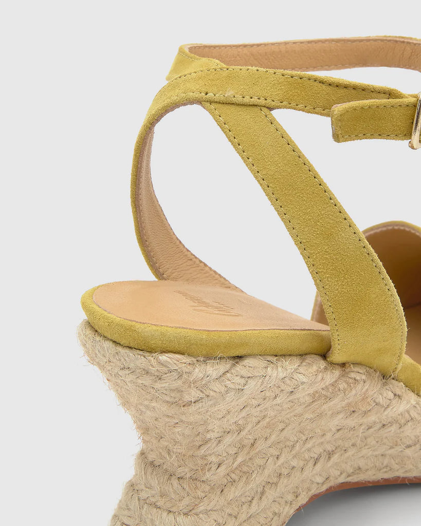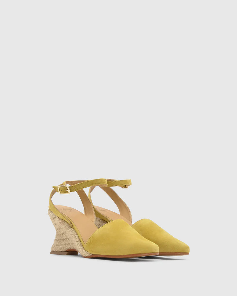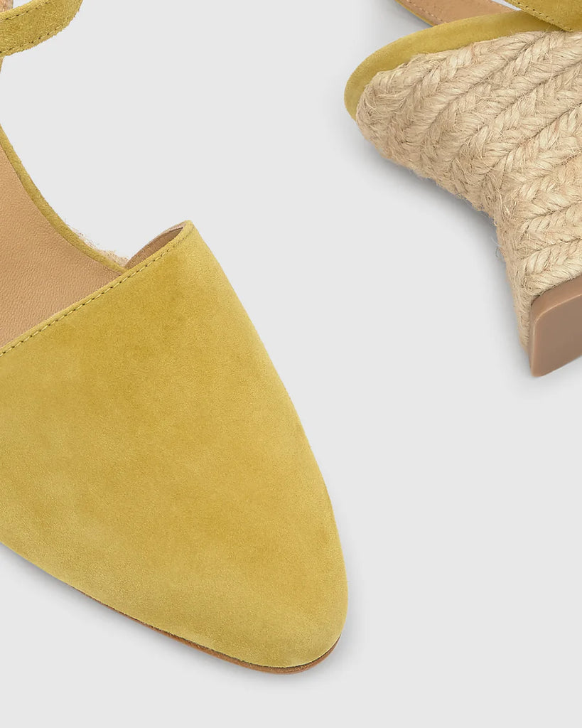 Judi espadrille in suede with buckle closing, cushioned insole, pointed toe and 8cm jute wedge.