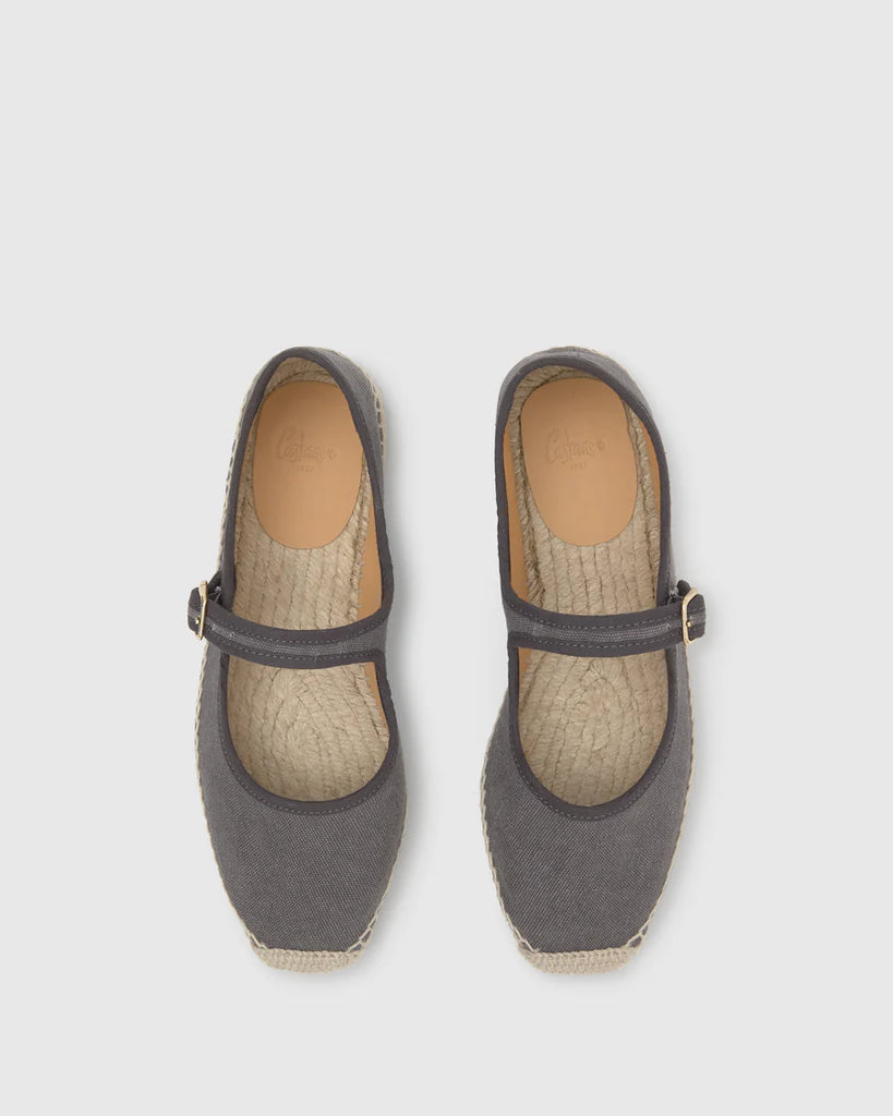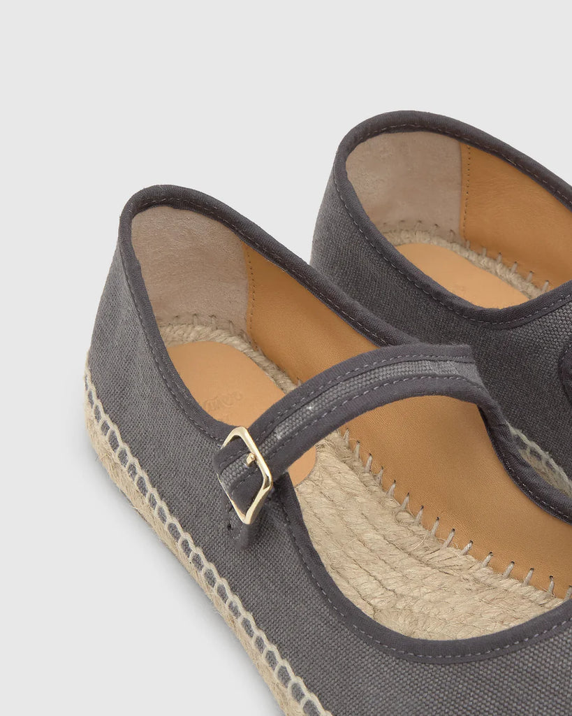 Padua mary-jane style flat espadrille in washed organic cotton with buckle closure and jute sole.