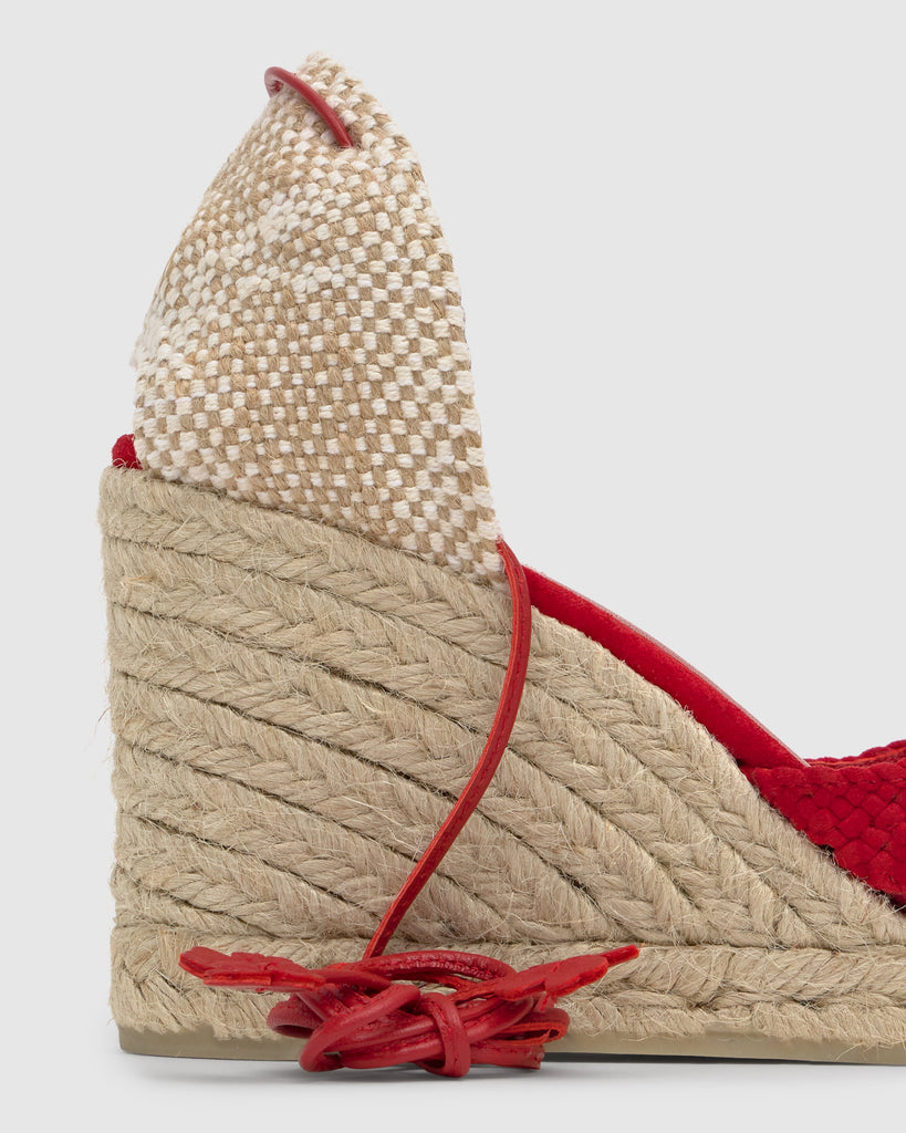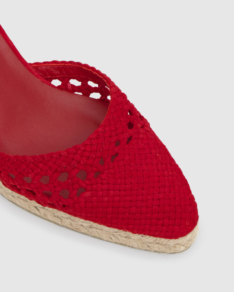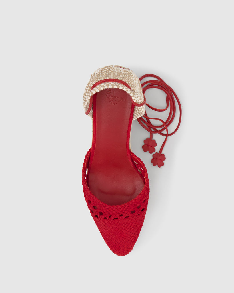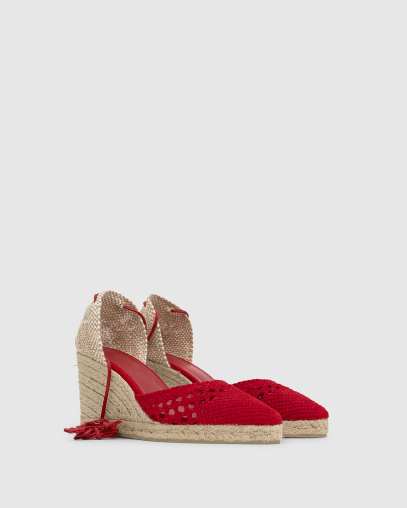 Jandri espadrille in hand-braided suede with matching lace-up closure, cushioned insole, and pointed toe. 9cm jute wedge.