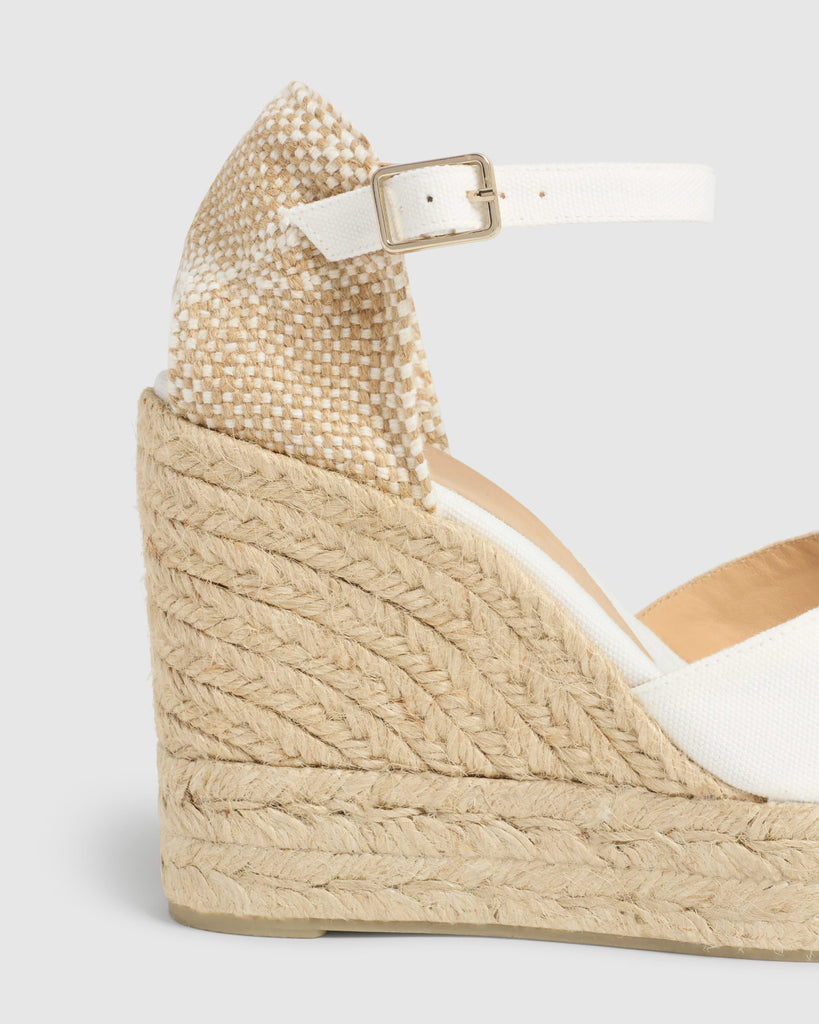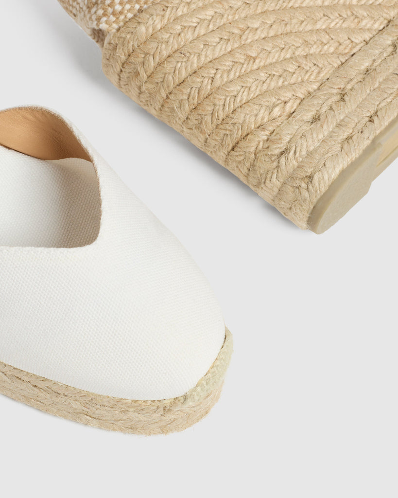 CHIARITA IS A COMPLETELY TIMELESS ESPADRILLE WITH JUTE WEDGE, A CLOSET ESSENTIAL FOR SUMMER DAYS, FOR THE JOIE DE VIVRE. WITH A FRONT V-NECKLINE, IT IS TIED AT THE ANKLE WITH A BUCKLE BRACELET AND THE HEEL IS BRAIDED AS ONLY AT CASTAÑER WE KNOW HOW TO DO IT, IN THE SAME HANDMADE WAY AS WHEN WE STARTED.