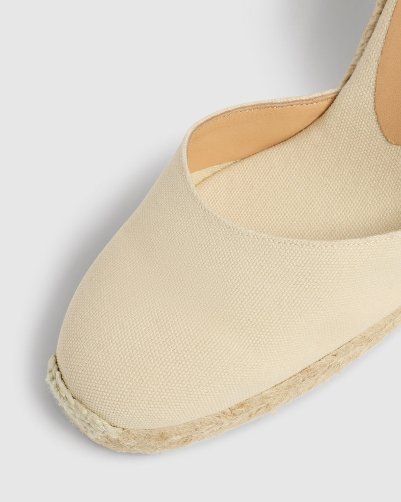 ESPADRILLE WITH WEDGE MADE IN COTTON CANVAS. DESIGN WITH BRAIDED FABRIC ON THE HEEL. TIP CLOSED AND ROUNDED WITH CAP. SOLE OF VULCANIZED RUBBER NATURAL COLOUR. HEIGH OF 9 CM, WEDGE OF 8 CM E PLATFORM OF 1 cm