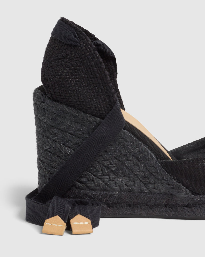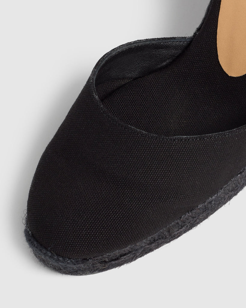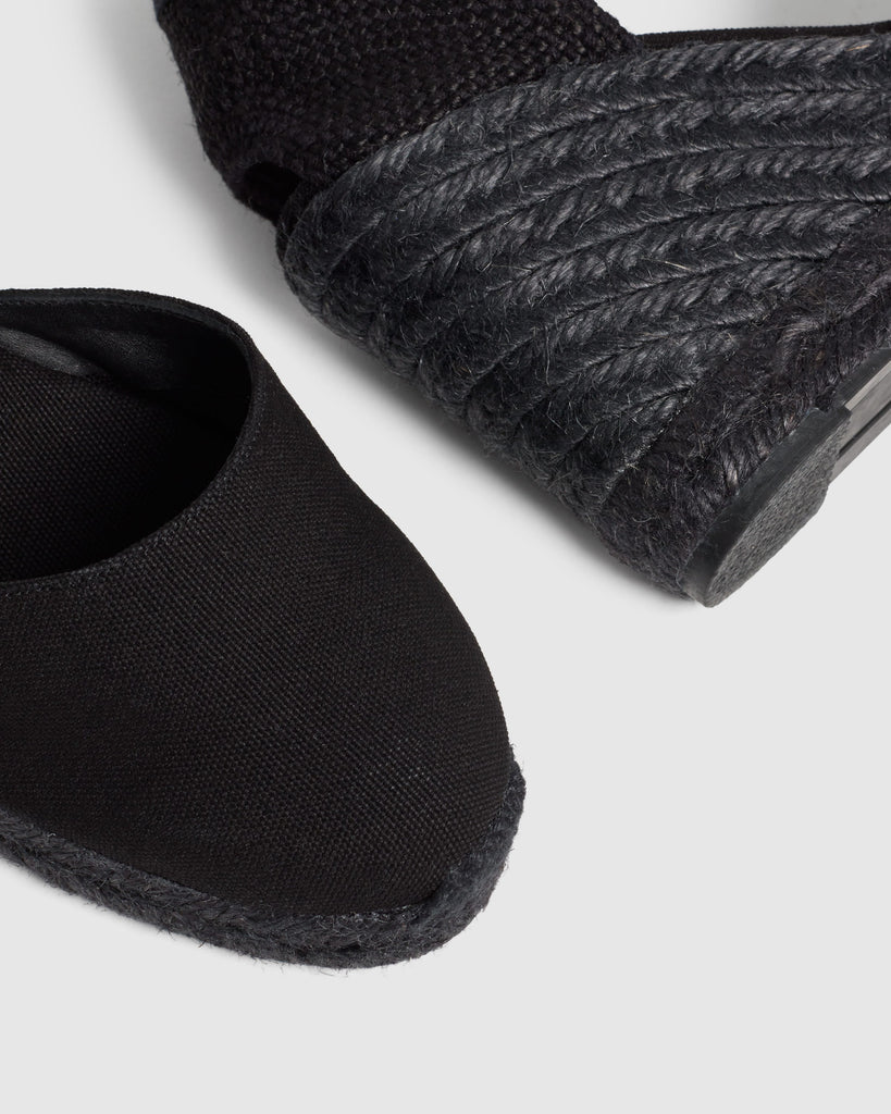 ESPADRILLE WITH WEDGE MADE IN COTTON CANVAS. DESIGN WITH BRAIDED FABRIC ON THE HEEL. TIP CLOSED AND ROUNDED WITH CAP. SOLE OF VULCANIZED RUBBER BLACK COLOUR. HEIGH OF 9 CM, WEDGE OF 8 CM E PLATFORM OF 1 cm