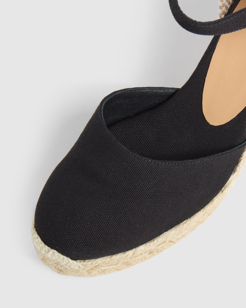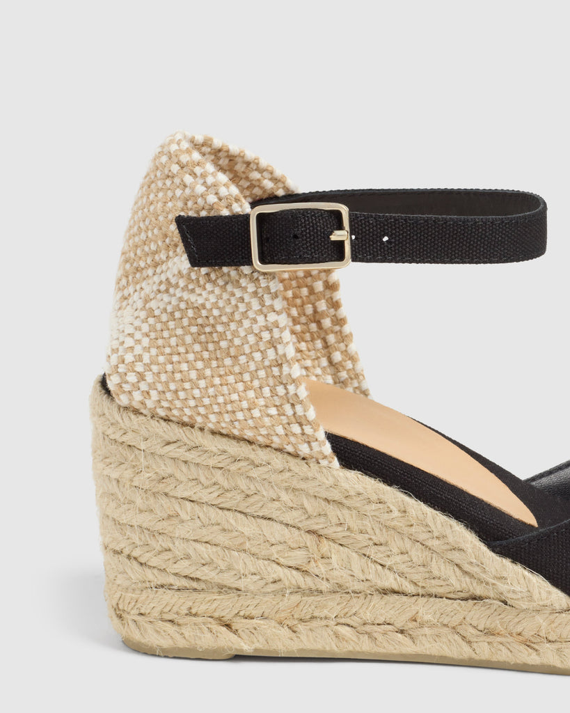 ESPADRILLE WITH WEDGE MADE IN COTTON CANVAS. DESIGN WITH BRAIDED FABRIC ON THE HEEL. CLOSURE WITH BUCKLE FASTENING. TIP CLOSED AND ROUNDED WITH CAP. SOLE OF VULCANIZED RUBBER OF NATURAL COLOUR.HEIGH OF 7 CM, WEDGE OF 6 CM E PLATFORM OF 1 cm