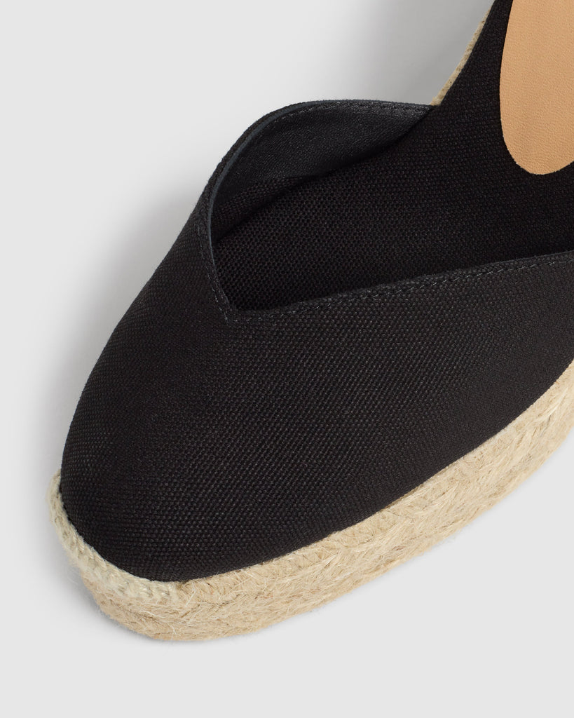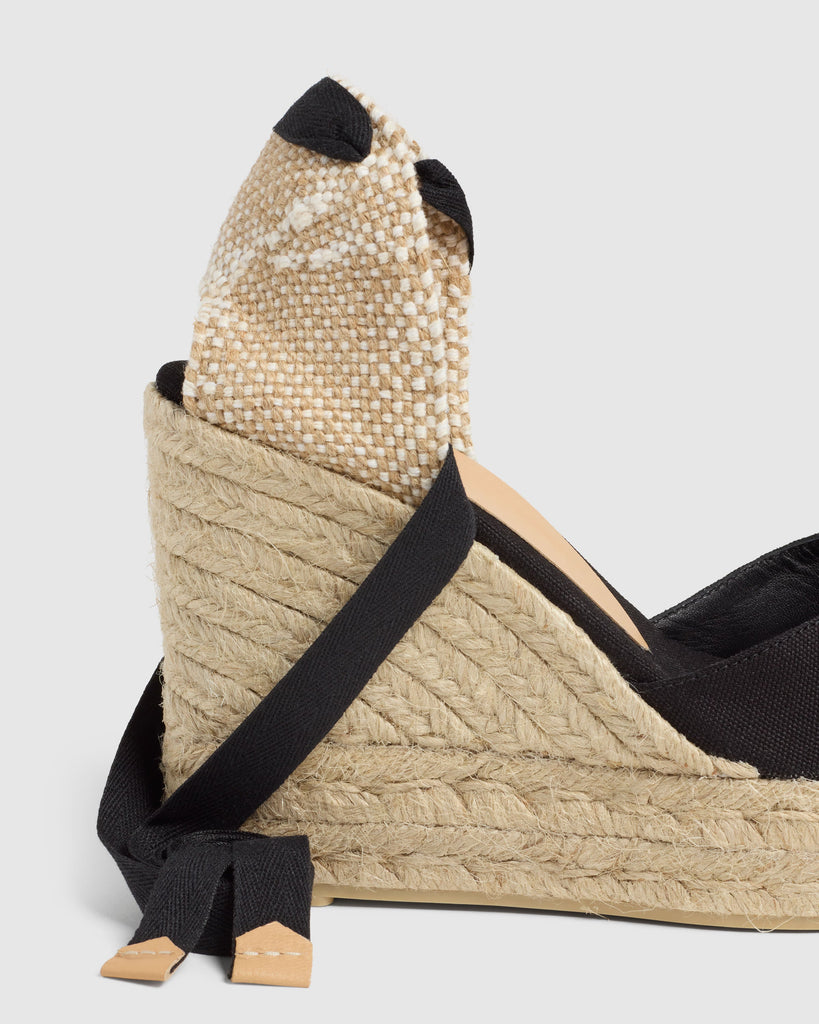 ESPADRILLE WITH WEDGE MADE OF COTTON CANVAS. V SHAPE CUT. WOVEN FABRIC AT THE HEEL. LACE-UP FASTENING AT THE ANKLE. ROUNDED TOE. VULCANIZED SOLE OF JUTE NATURAL COLOUR AND RUBBER. HEIGHT OF 11CM, WEDGE OF 8CM AND PLATFORM OF 3cm