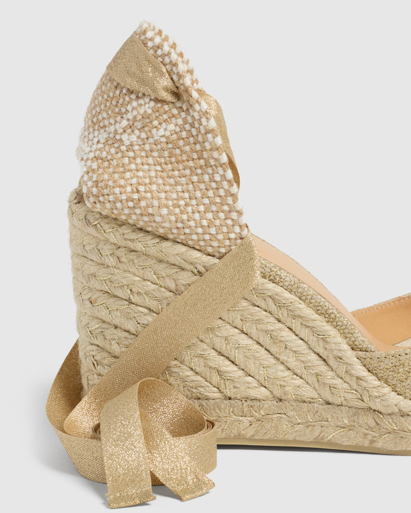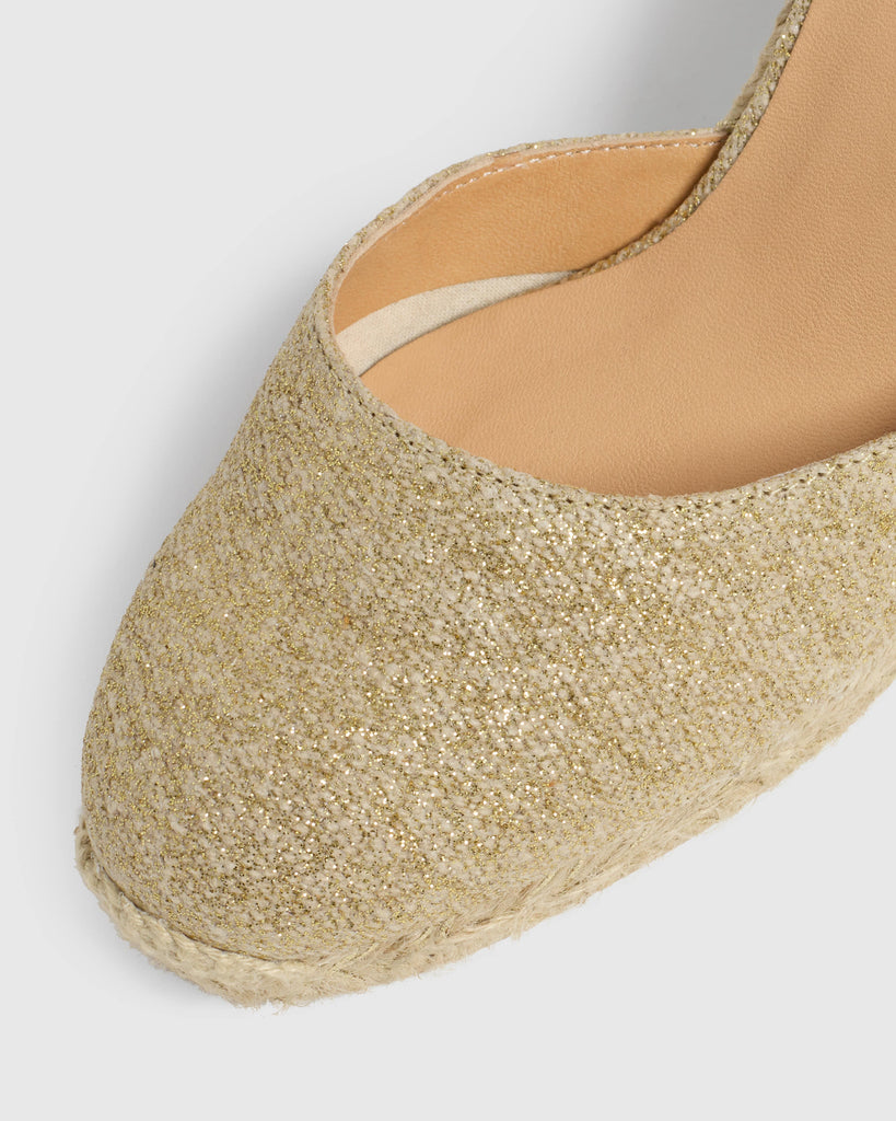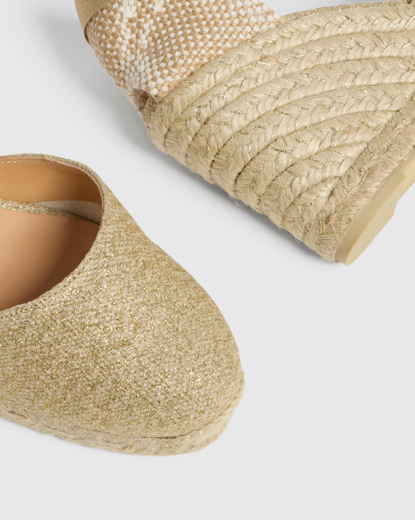 WEDGE ESPADRILLE MADE OF METALLIC LINEN. GOLD GLITTER EFFECT DESIGN. BRAIDED DESIGN AT THE HEEL. LACE UP FASTENING. ROUNDED TIP. VULCANIZED SOLE OF JUTE NATURAL COLOUR, GOLD LUREX AND RUBBER. HEIGHT OF 9CM, WEDGE OF 8CM AND PLATFORM OF 1cm