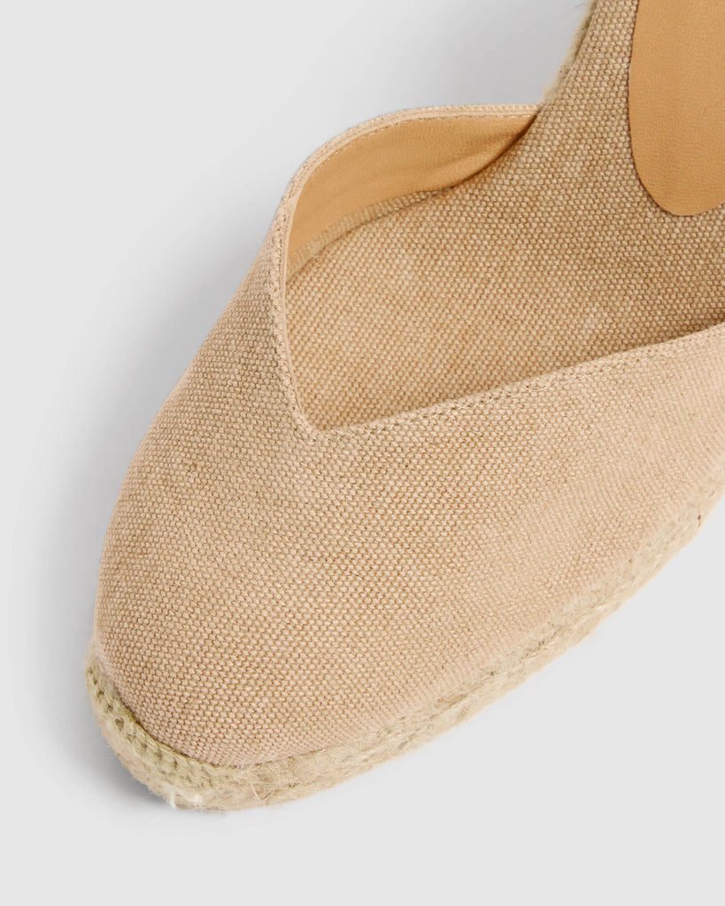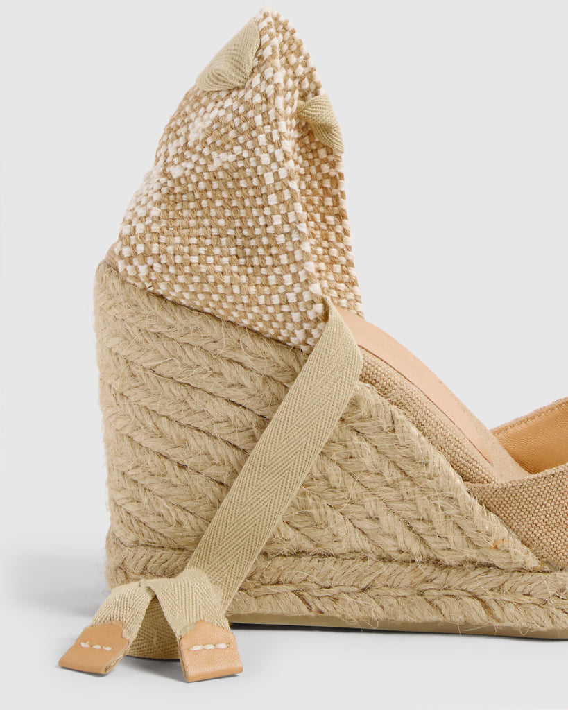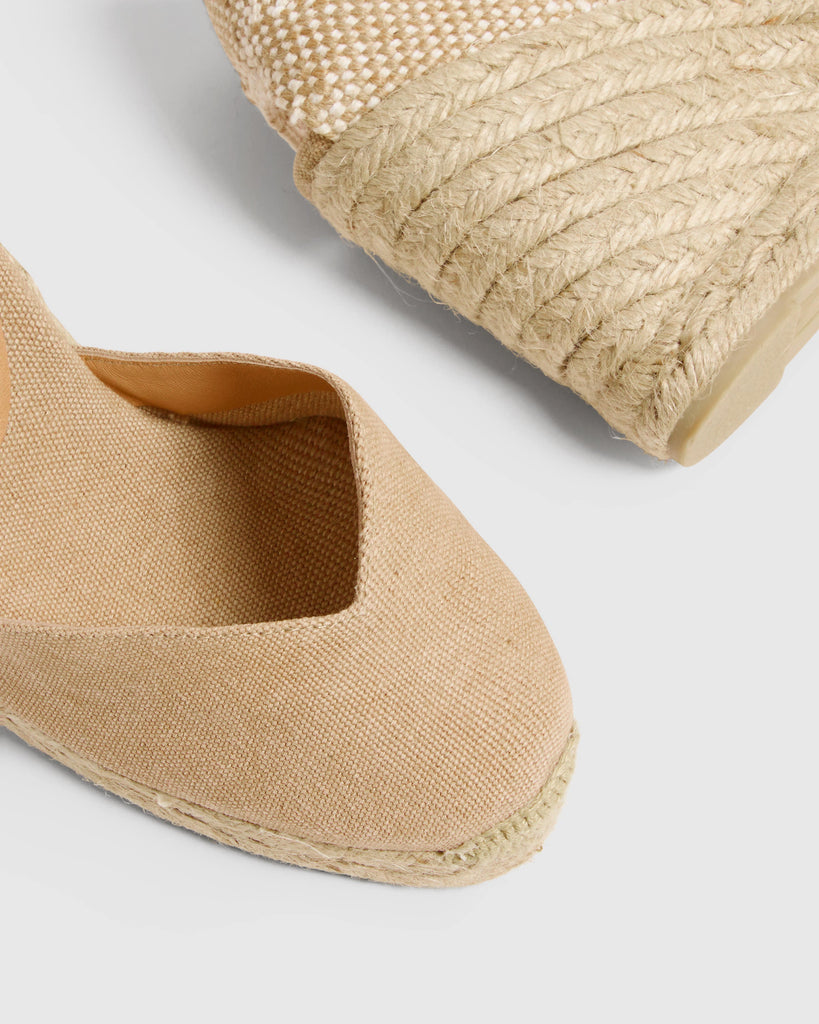 SHOW OFF YOUR UNIQUE STYLE WITH CHIARA, OUR ICONIC ESPADRILLES THAT YOU CAN WEAR ON THOSE SPECIAL OCCASIONS. MADE IN SPAIN WITH WASHED ORGANIC COTTON, THE CHIARA ESPADRILLES FEATURE A V FRONT, ROUND CLOSED TOE, TIE CLOSE, 9 CM WEDGE AND VULCANISED-RUBBER SOLE.