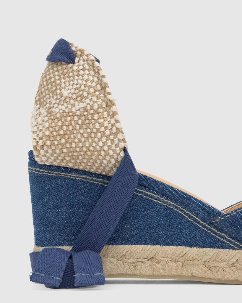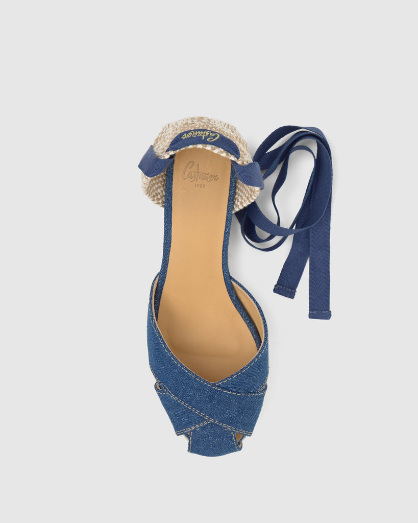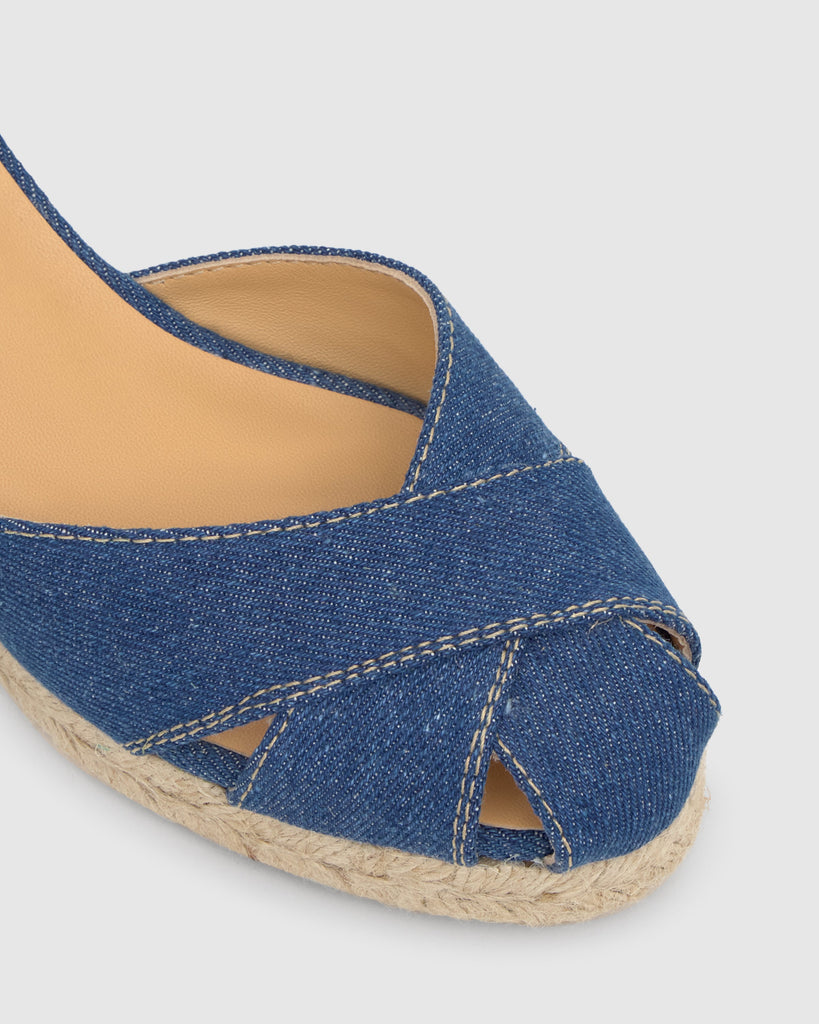 Chabeli denim espadrille with strap closure, semi-open toe, padded insole, and 7cm jute wedge with matching lining.