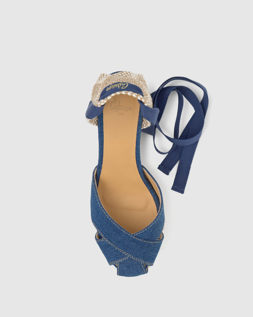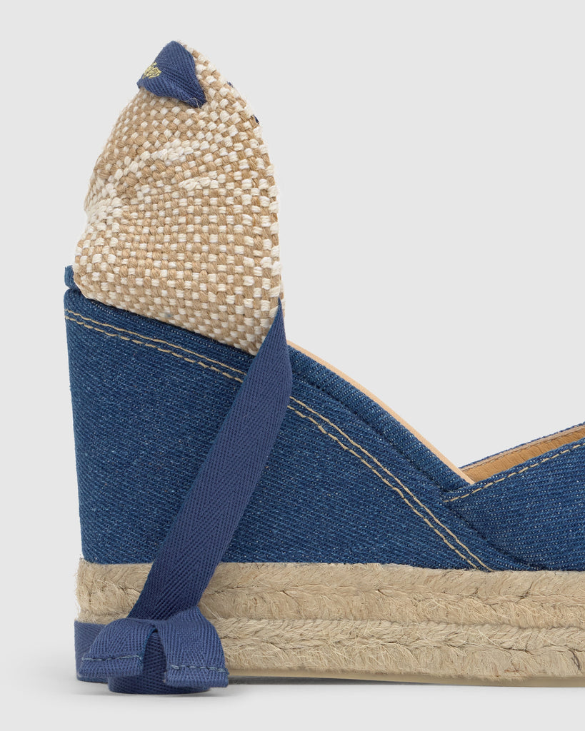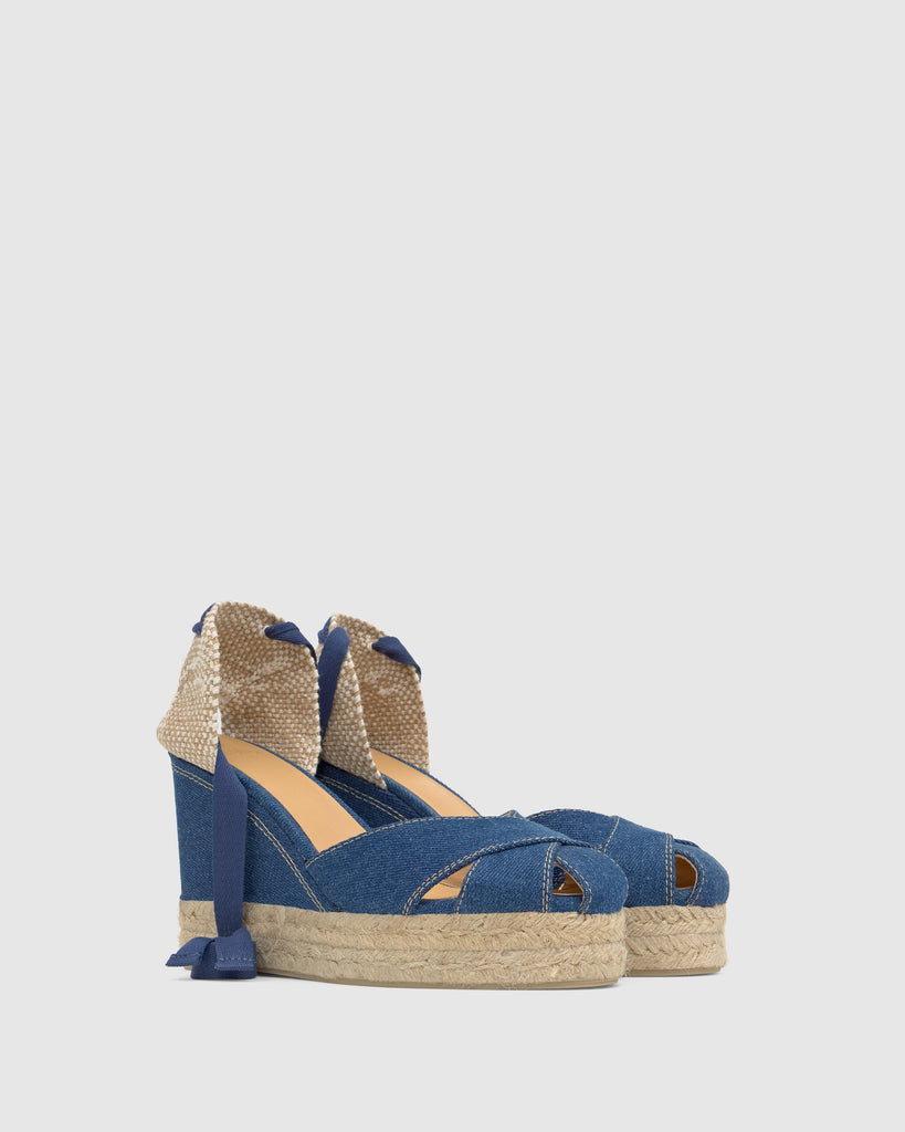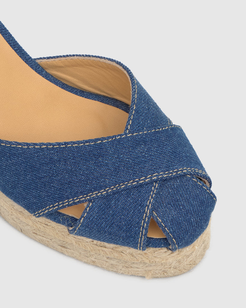 Chabeli denim espadrille with strap closure, semi-open toe, padded insole, and 11cm jute wedge lined with matching double platform.