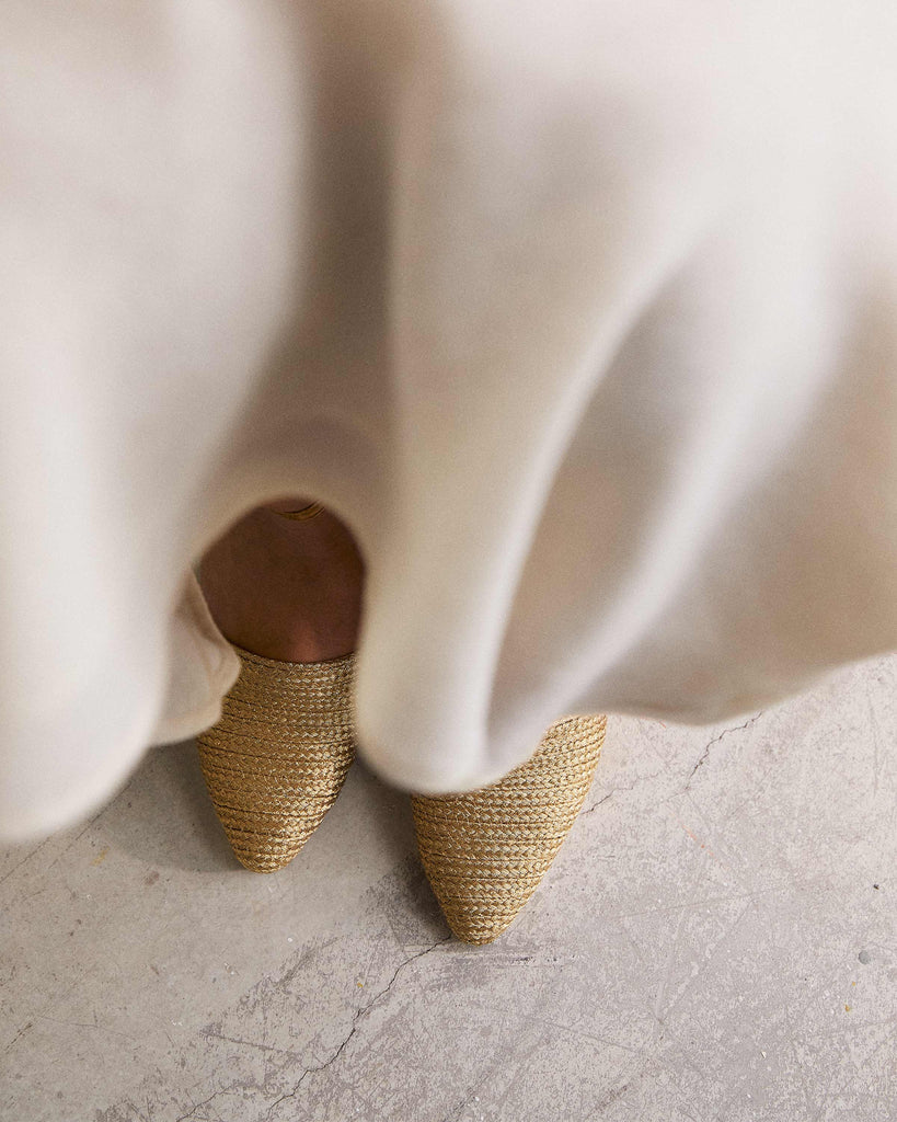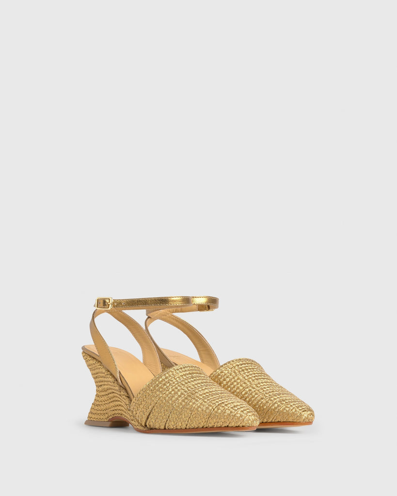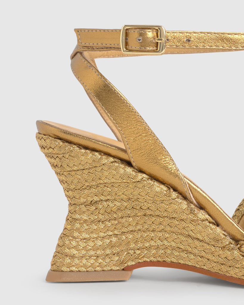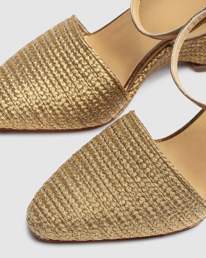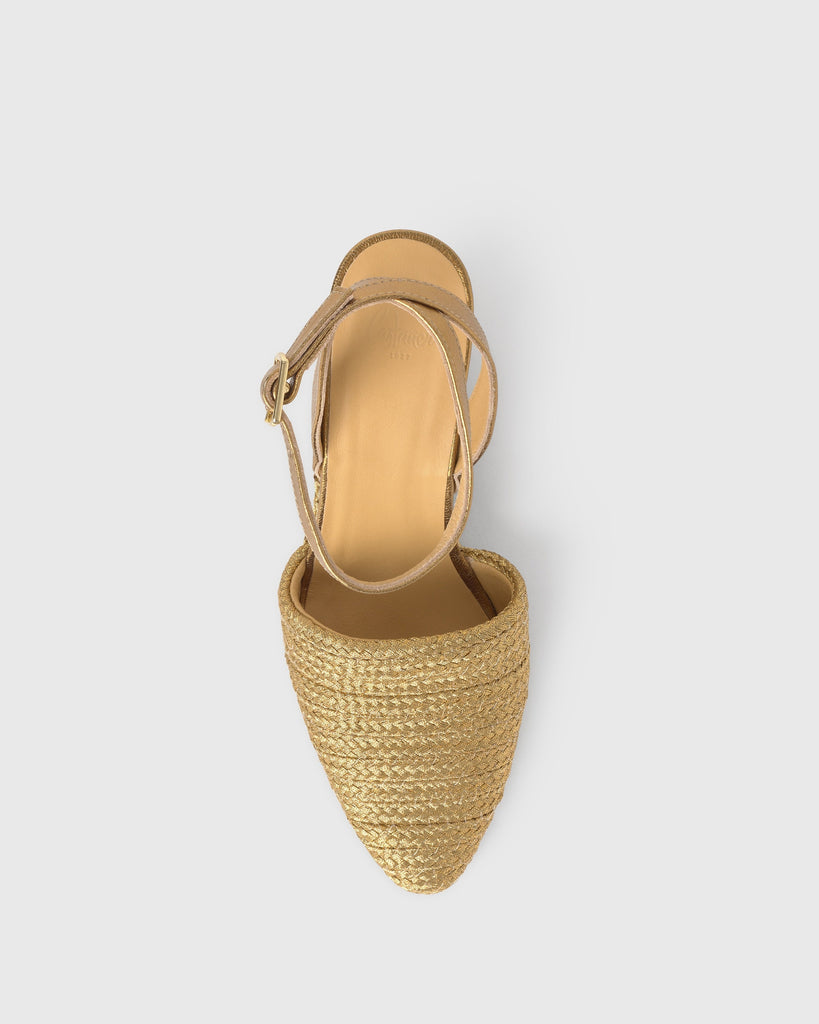 Julia espadrille with handmade metallic braiding, bracelet closure, padded insole and sharp toe. 8cm wedge lined to match.