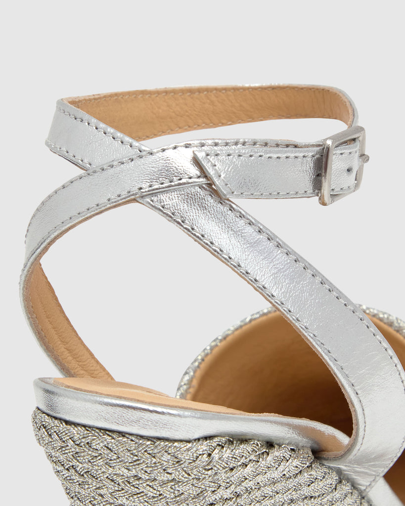 Julia espadrille with handmade metallic braiding, bracelet closure, padded insole and sharp toe. 8cm wedge lined to match.