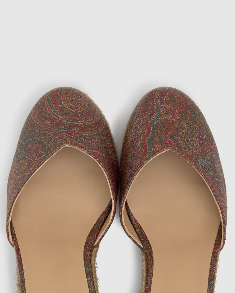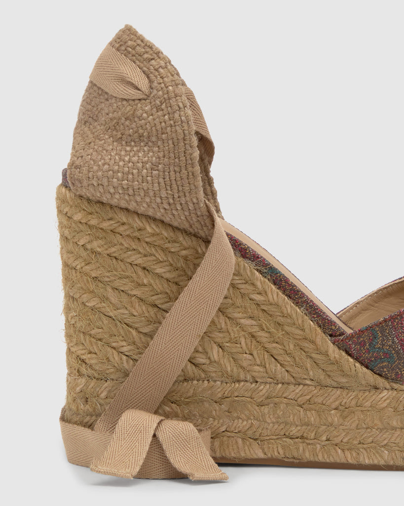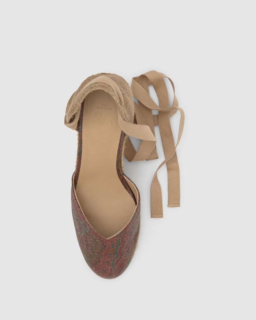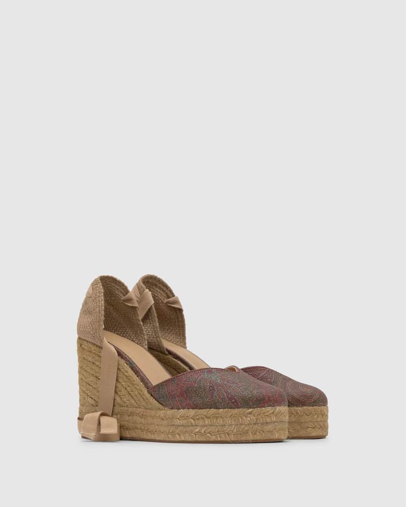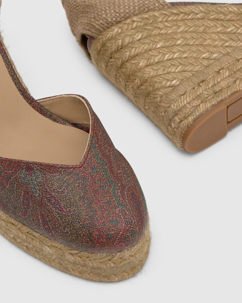 Timeless Chiara espadrille in ETRO's iconic jacquard fabric with a rubberized finish. Lace closure, padded insole and V-neckline. Characteristic 11cm taupe jute wedge with double Castañer platform.