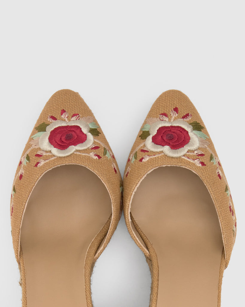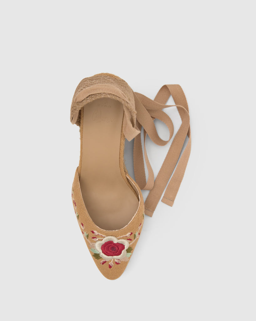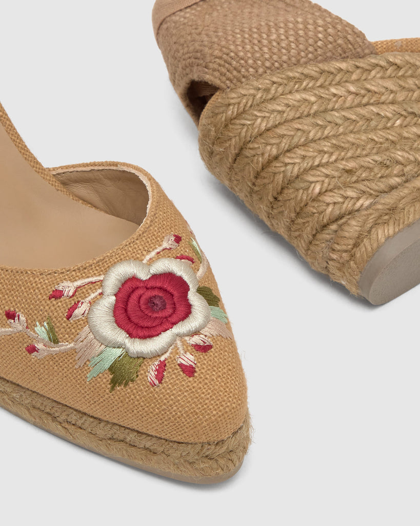 Iconic Joyce espadrille in linen with embroidered floral design designed by ETRO. Ribbon closure, sharp toe, padded insole and 9cm taupe jute wedge.