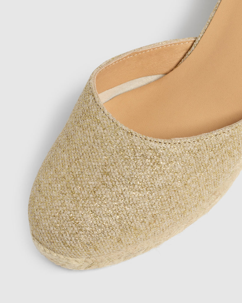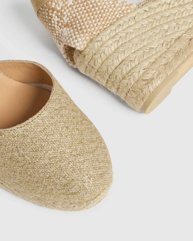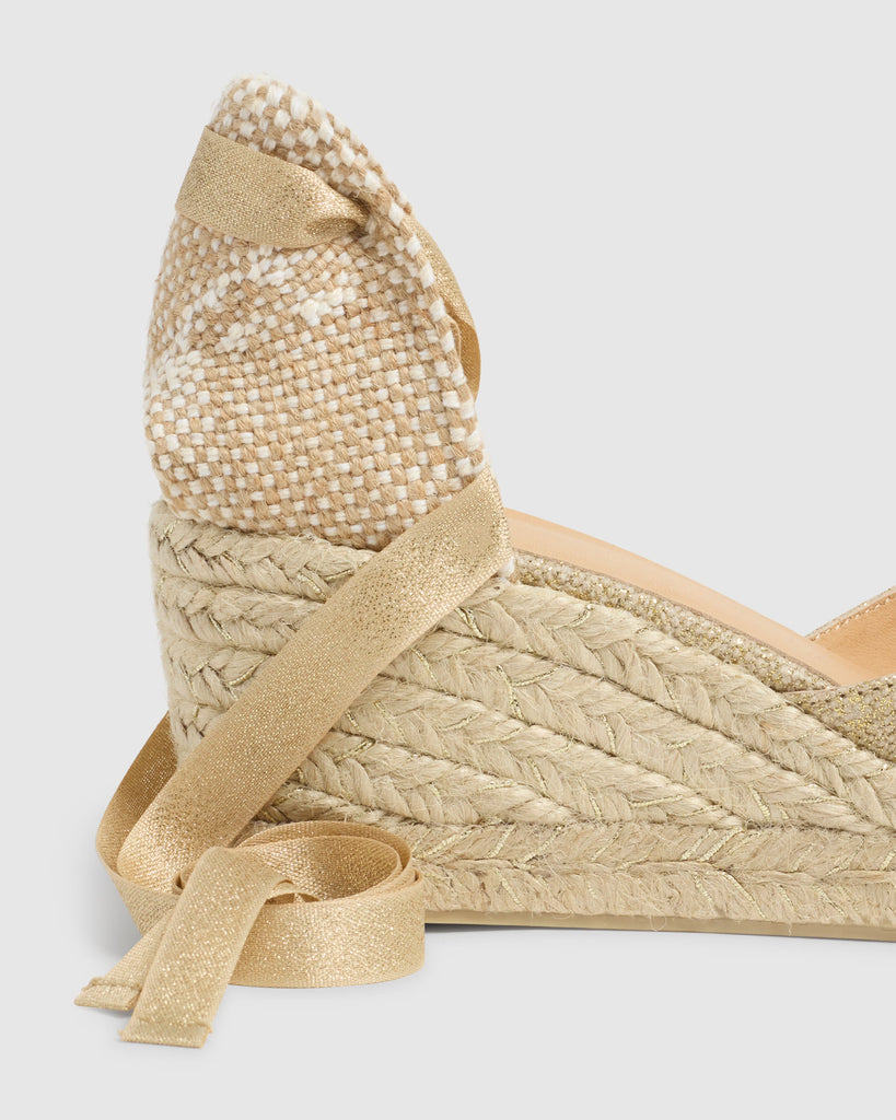 OUR ICONIC CARINA ESPADRILLES RETURN EVERY SEASON AS A TIMELESS ESSENTIAL AMONG YOUR WARDROBE BASICS. MADE IN SPAIN WITH METALLIC LINEN, THE CARINA ESPADRILLES FEATURE A ROUND CLOSED TOE, TIE CLOSE, 7 CM WEDGE AND VULCANISED-RUBBER SOLE.