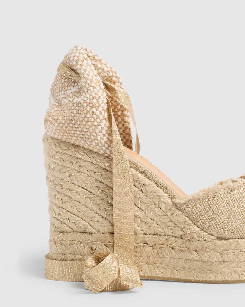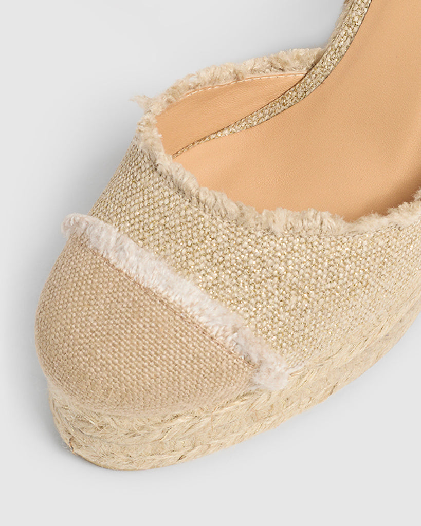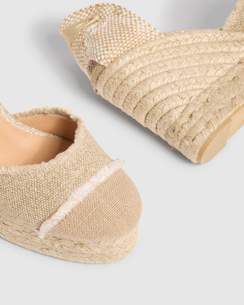 LINEN ESPADRILLE WEDGES. D’ORSAY PUMPS WITH ANKLE TIE. ROUND, CLOSED TOE. VULCANISED-RUBBER SOLE. HEIGHT 11 CM, WEDGE 8 CM AND PLATFORM 3 cm