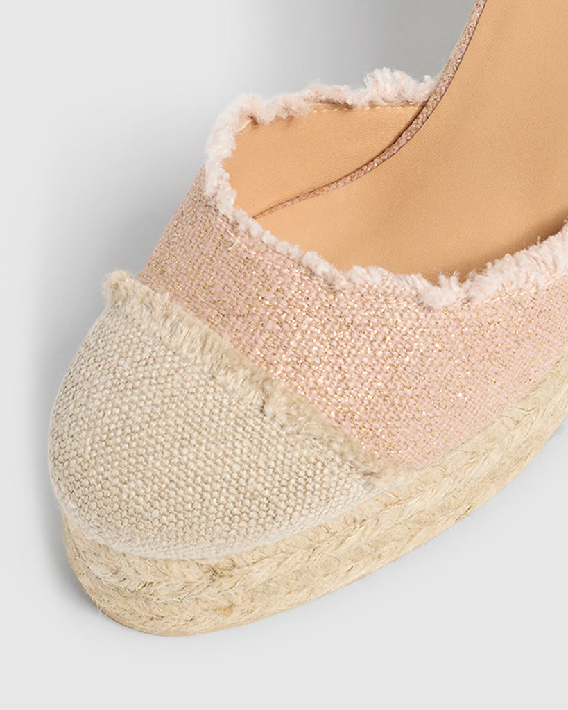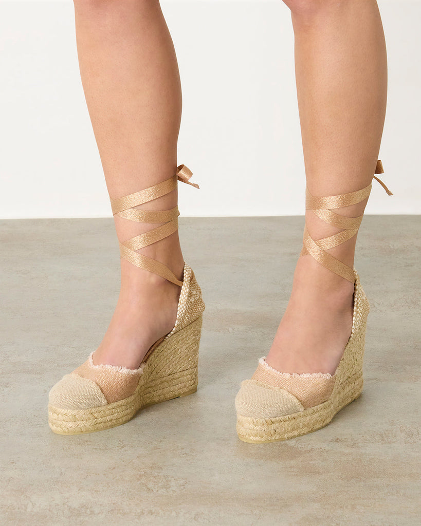LINEN ESPADRILLE WEDGES. D’ORSAY PUMPS WITH ANKLE TIE. ROUND, CLOSED TOE. VULCANISED-RUBBER SOLE. HEIGHT 11 CM, WEDGE 8 CM AND PLATFORM 3 cm