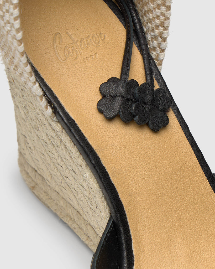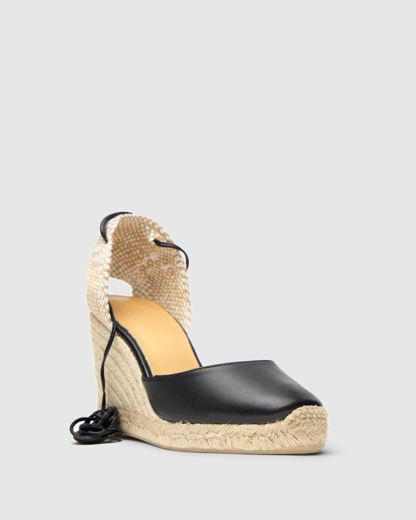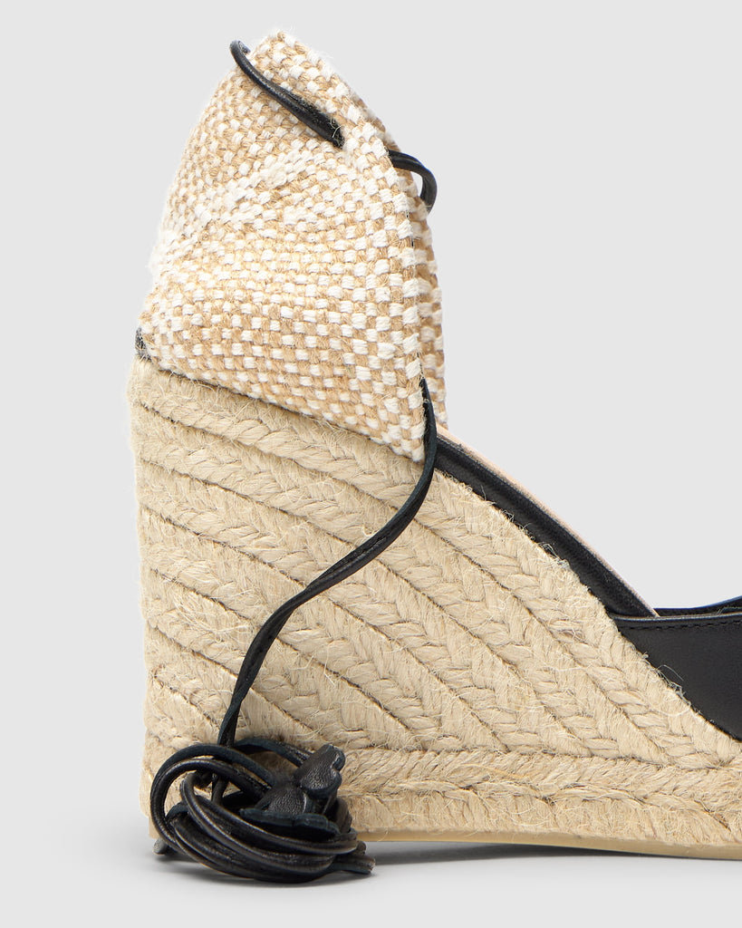 Carina espadrille in nappa leather with leather cord closure, padded insole and 9 cm jute wedge.