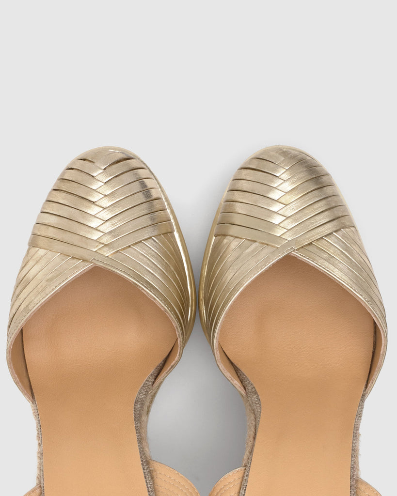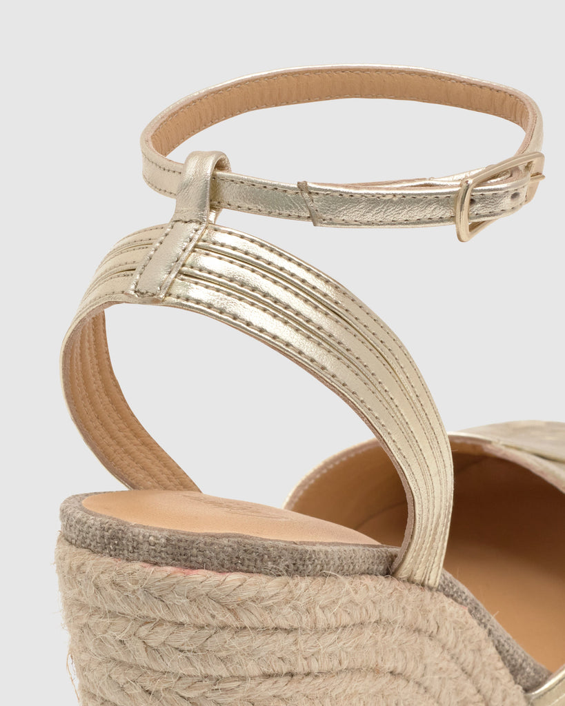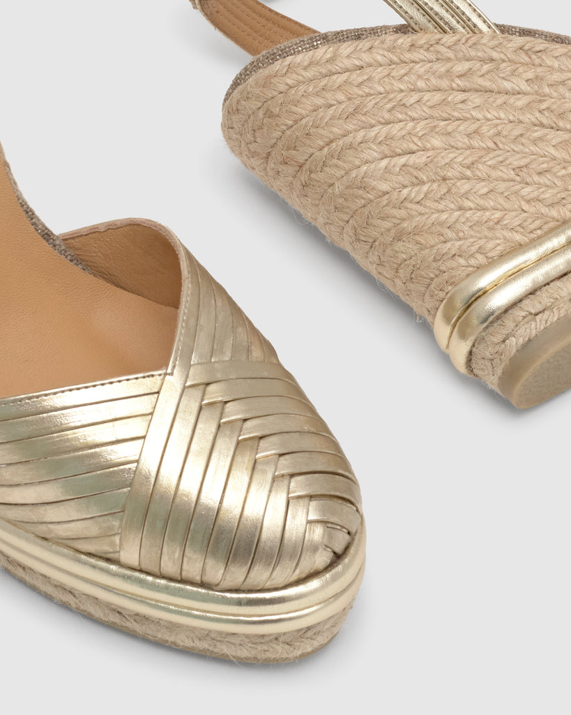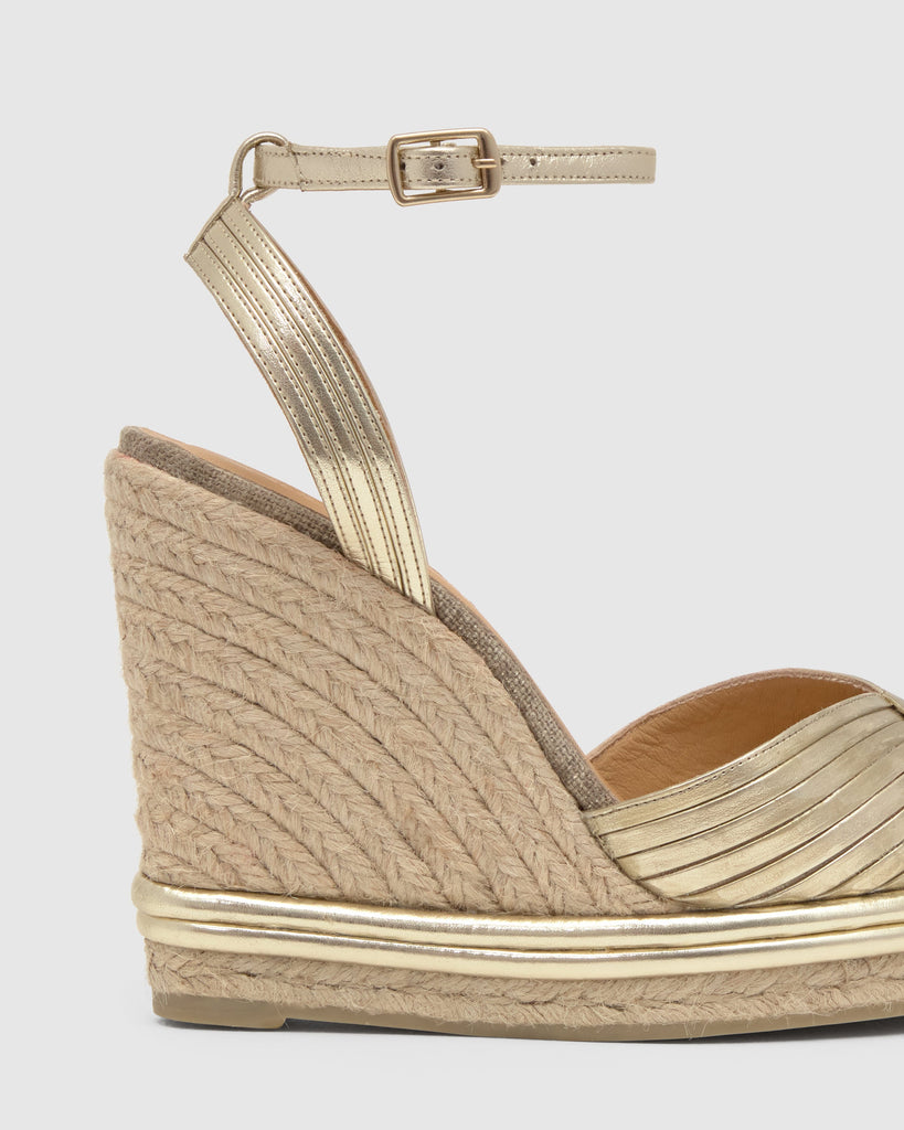 Colina espadrille in braided leather with bracelet closure and padded insole. 13cm jute wedge with leather detail on the platform.