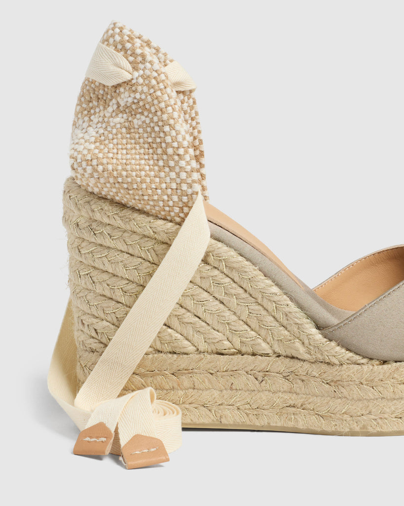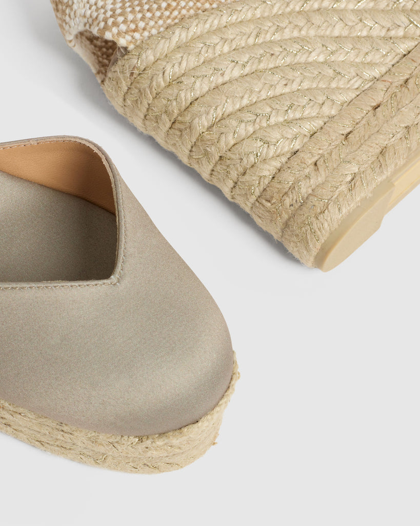 ESPADRILLE WITH WEDGE MADE OF SATIN. V SHAPE CUT . WEDGE DECORATED WITH METALLIC THREAD. BRAIDED FABRIC AT THE HEEL. LACE UP FASTENING. ROUNDED TIP. NATURAL COLOUR JUTE AND RUBBER SOLE. HEIGHT OF 11CM, WEDGE OF 8CM AND PLATFORM OF 3cm