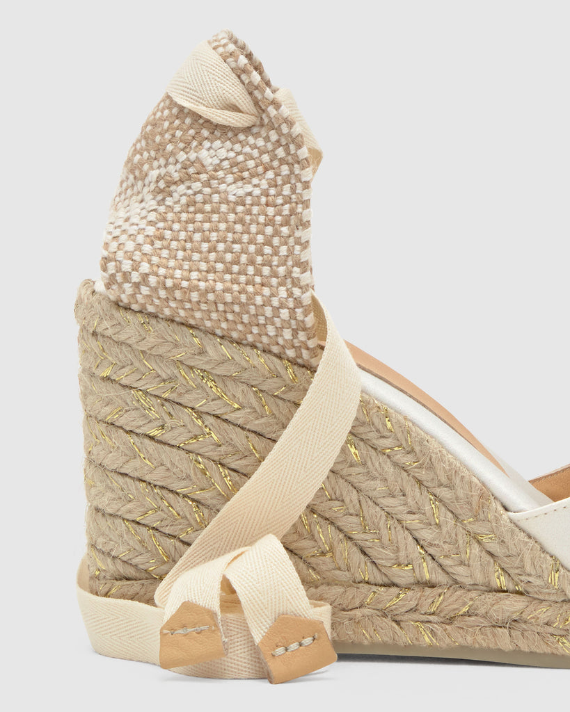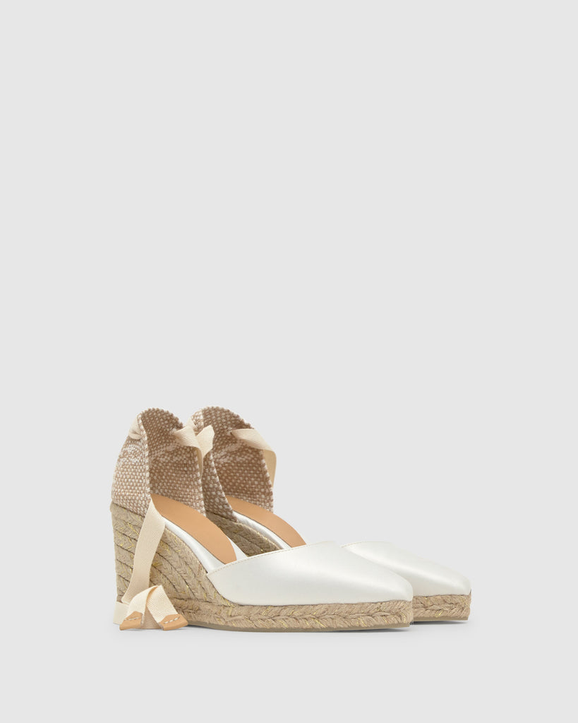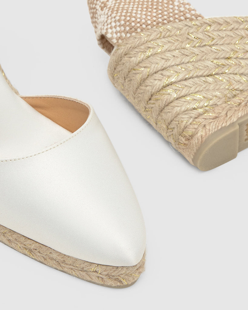 Iconic Joyce espadrille in satin with ribbon closure, padded insole and pointed toe. 9cm jute wedge.