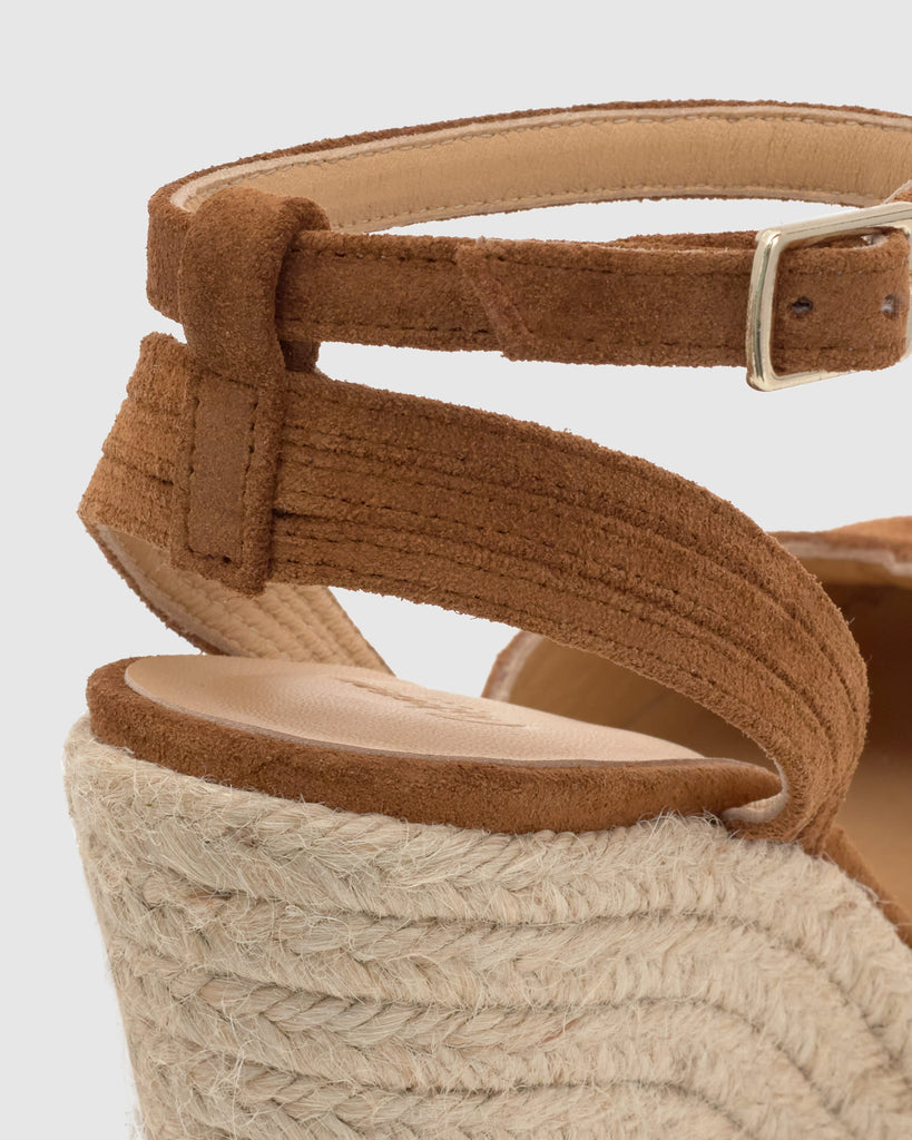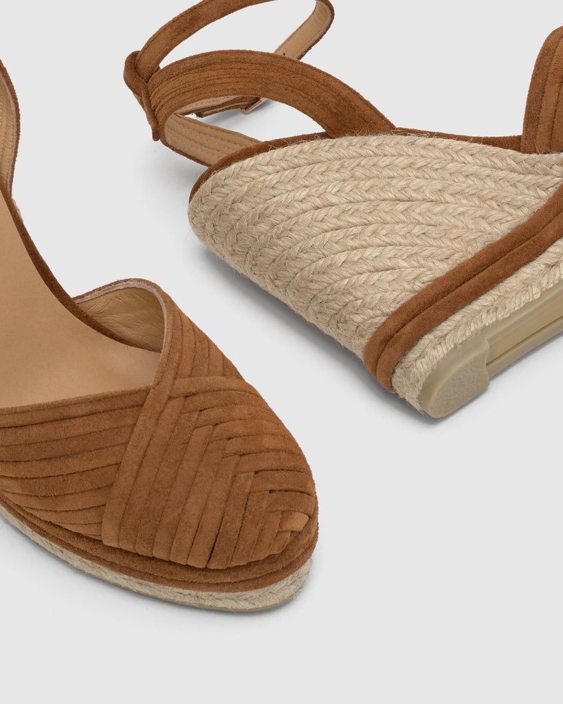 Colina espadrille in braided suede with bracelet closure, padded insole and V-neckline. 13cm jute wedge with suede detail on the platform.