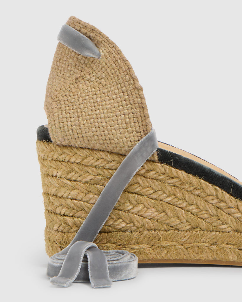 Stand out with the CHIARA BEADS velvet espadrilles, hand-made in Spain with golden accents. They feature a tie close and comfortable 7cm wedge.