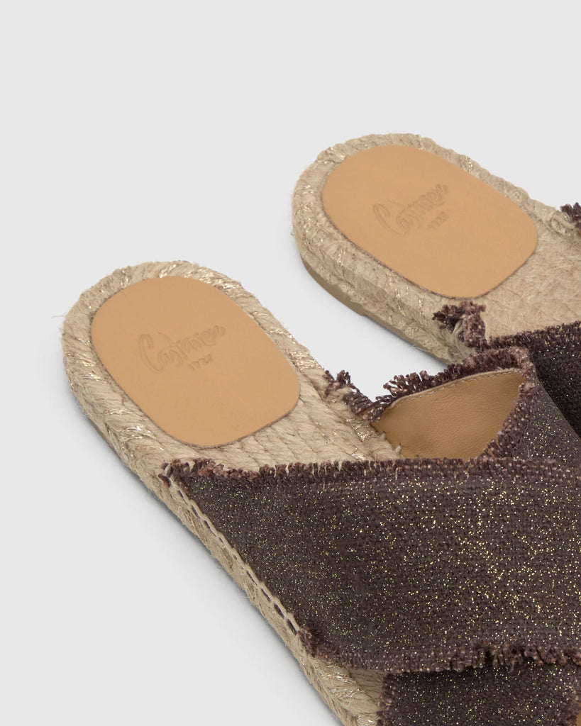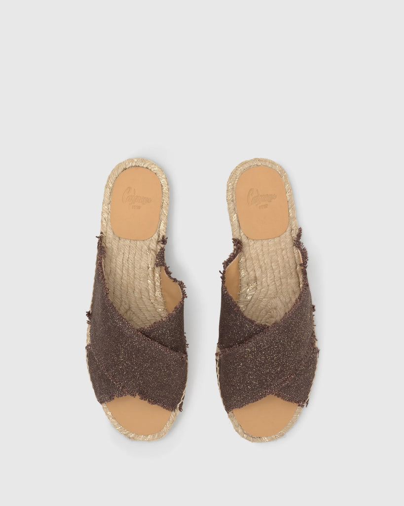 Palmera flat slip-on sandal in metallic linen with cross-cut, a fun frayed pattern and jute and lurex sole