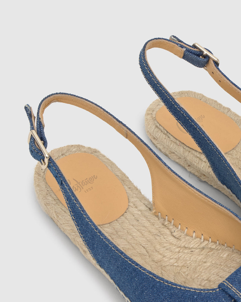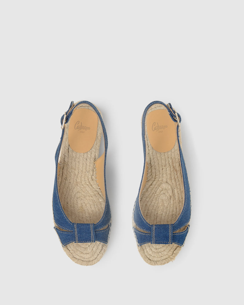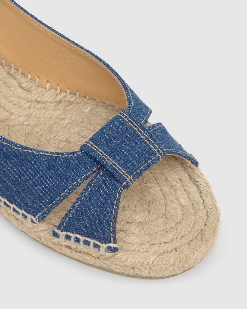 Peep-toe espadrille in denim with an adjustable buckle and a knot detail on the vamp.