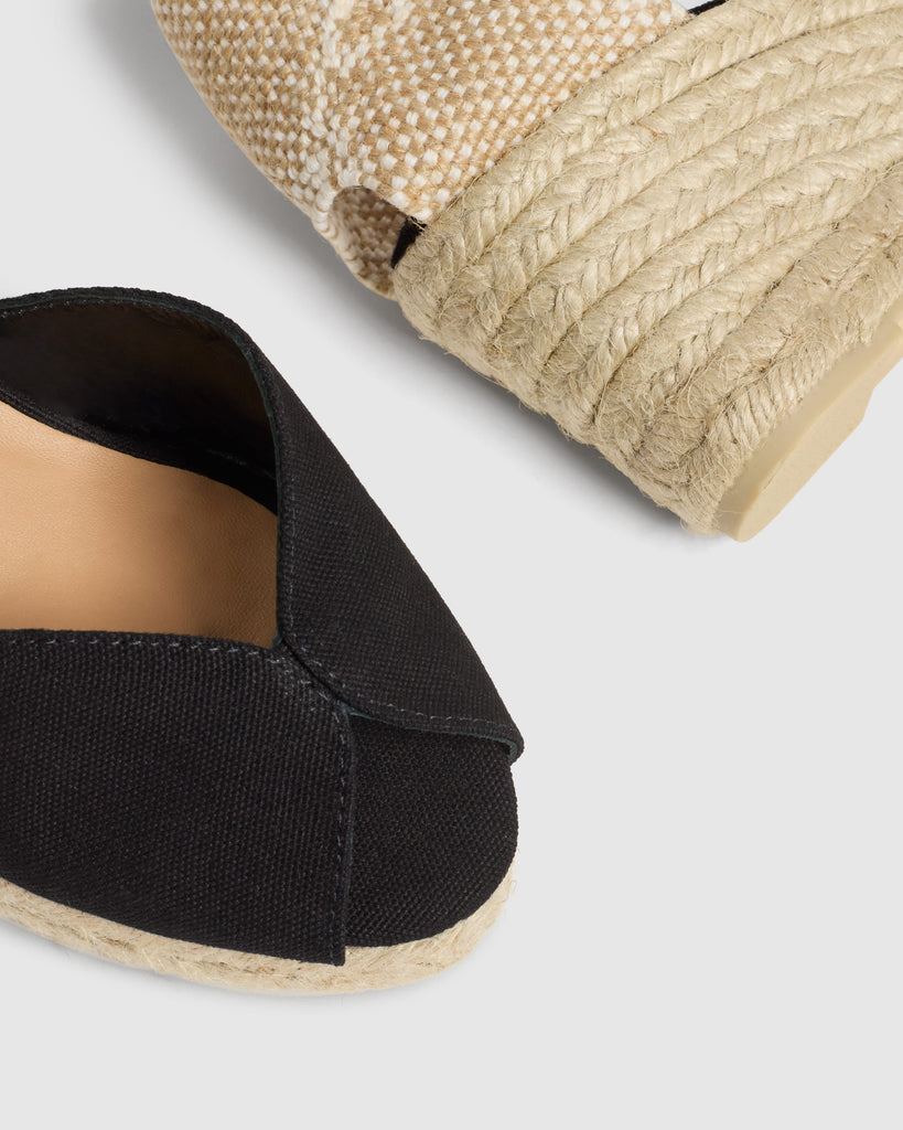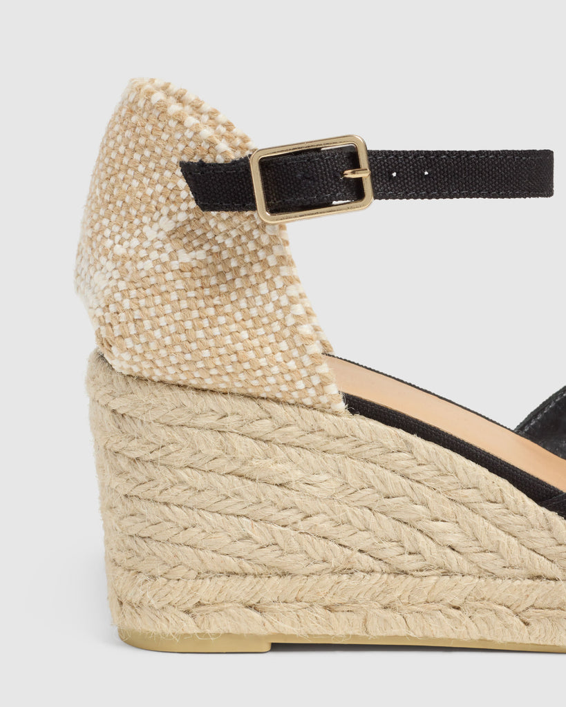 SPICE UP YOUR LOOKS WITH OUR BIANCA ESPADRILLES, A UNIQUE STYLE PACKED WITH PERSONALITY. HAND-MADE IN SPAIN WITH CERTIFIED-ORGANIC COTTON, THE BIANCA ESPADRILLES WILL BE YOUR BEST ALLY FOR EVERYDAY WEAR. THEY FEATURE A ROUND OPEN TOE, ANKLE STRAP WITH SIDE BUCKLE CLOSE, 7 CM WEDGE AND VULCANISED-RUBBER SOLE.