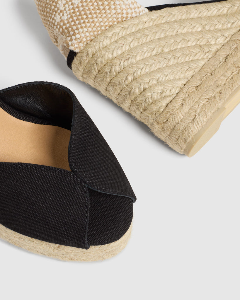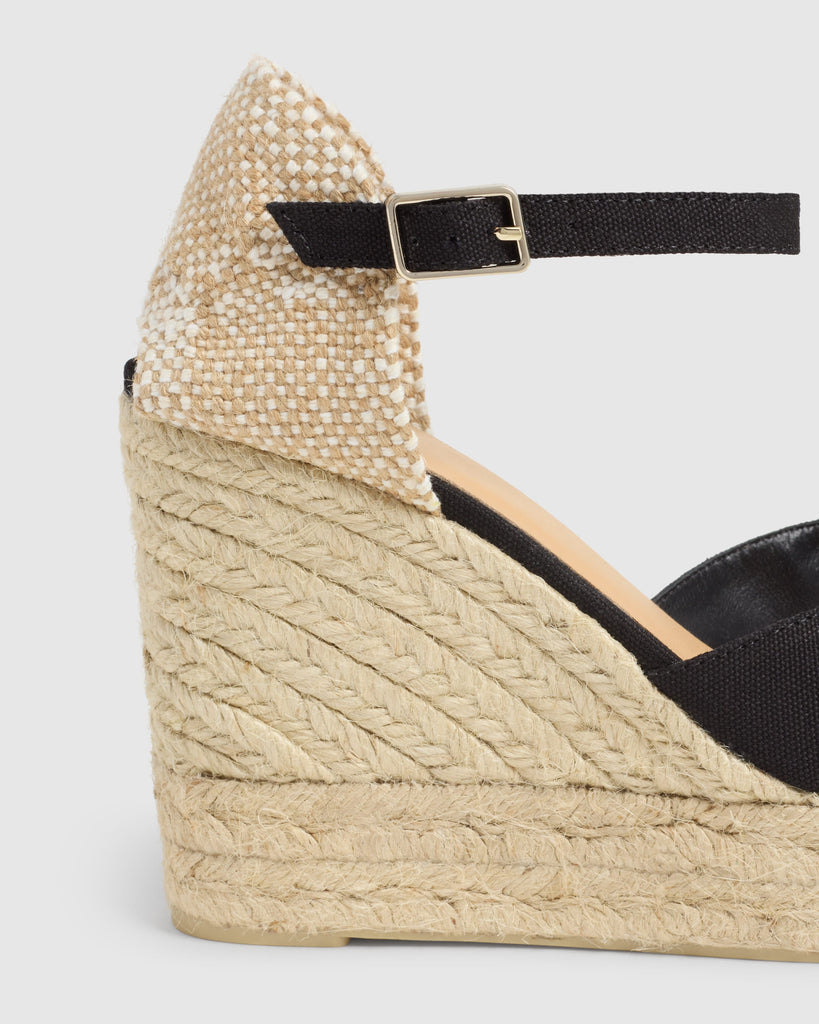 WEDGE ESPADRILLE MADE OF COTTON CANVAS. PEEP TOE DESIGN WITH WOVEN FABRIC AT THE HEEL. ANKLE STRAP. BUCKLE FASTENING. ROUNDED TIP. VULCANIZED SOLE OF JUTE NATURAL COLOUR AND RUBBER. HEIGHT OF 11CM, WEDGE OF 8CM AND PLATFORM OF 3cm