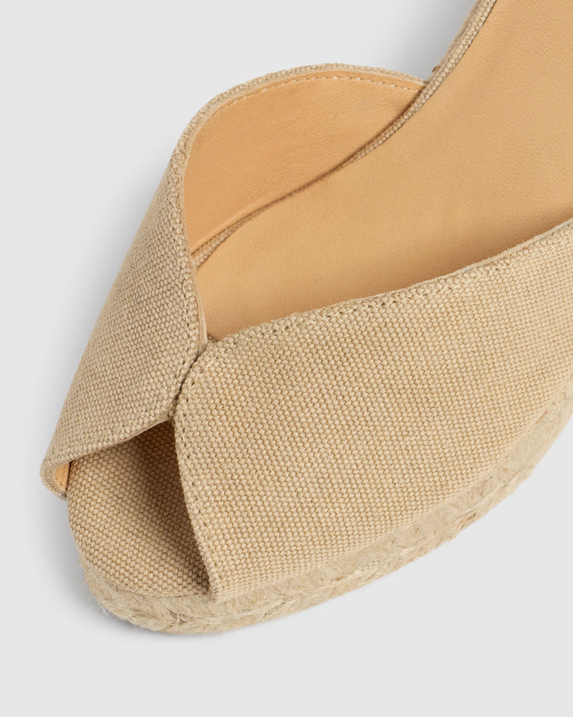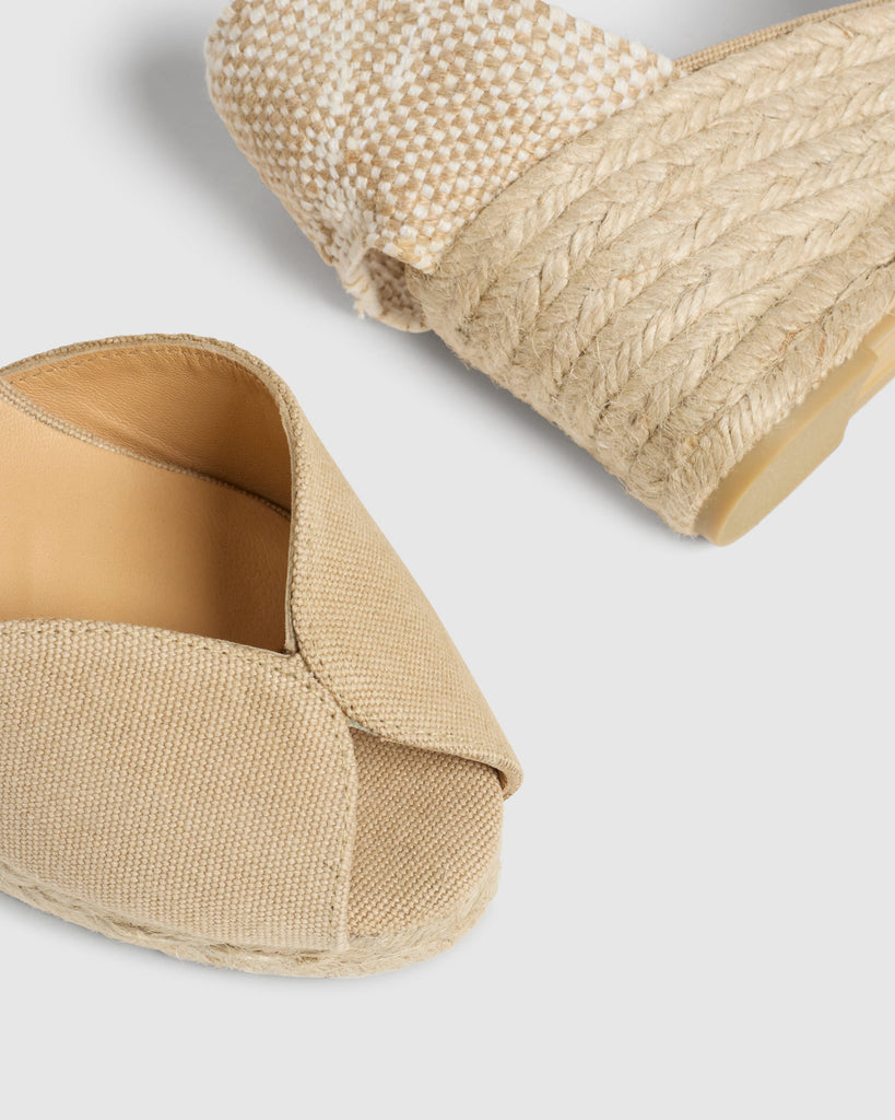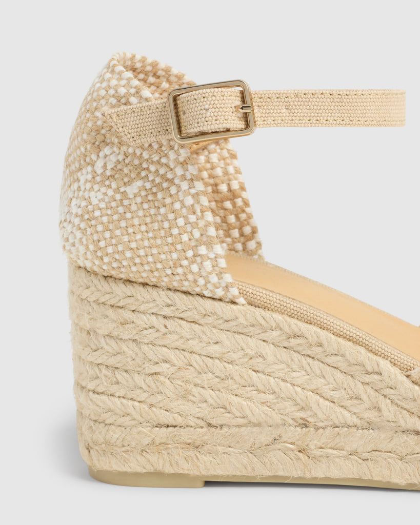 WEDGE ESPADRILLE MADE OF COTTON CANVAS. PEEP TOE DESIGN WITH WOVEN FABRIC AT THE HEEL. ANKLE STRAP. BUCKLE FASTENING. ROUNDED TIP. VULCANIZED SOLE OF JUTE NATURAL COLOUR AND RUBBER. HEIGHT OF 7CM, WEDGE OF 6CM AND PLATFORM OF 1cm