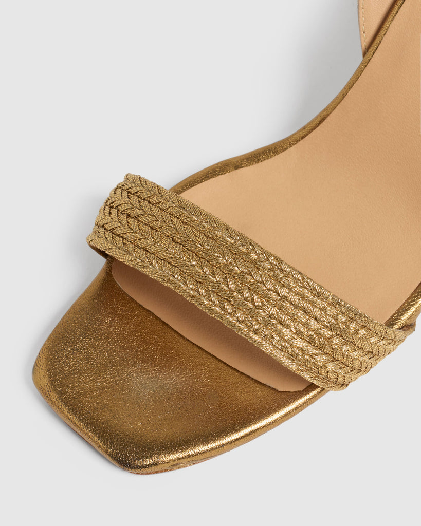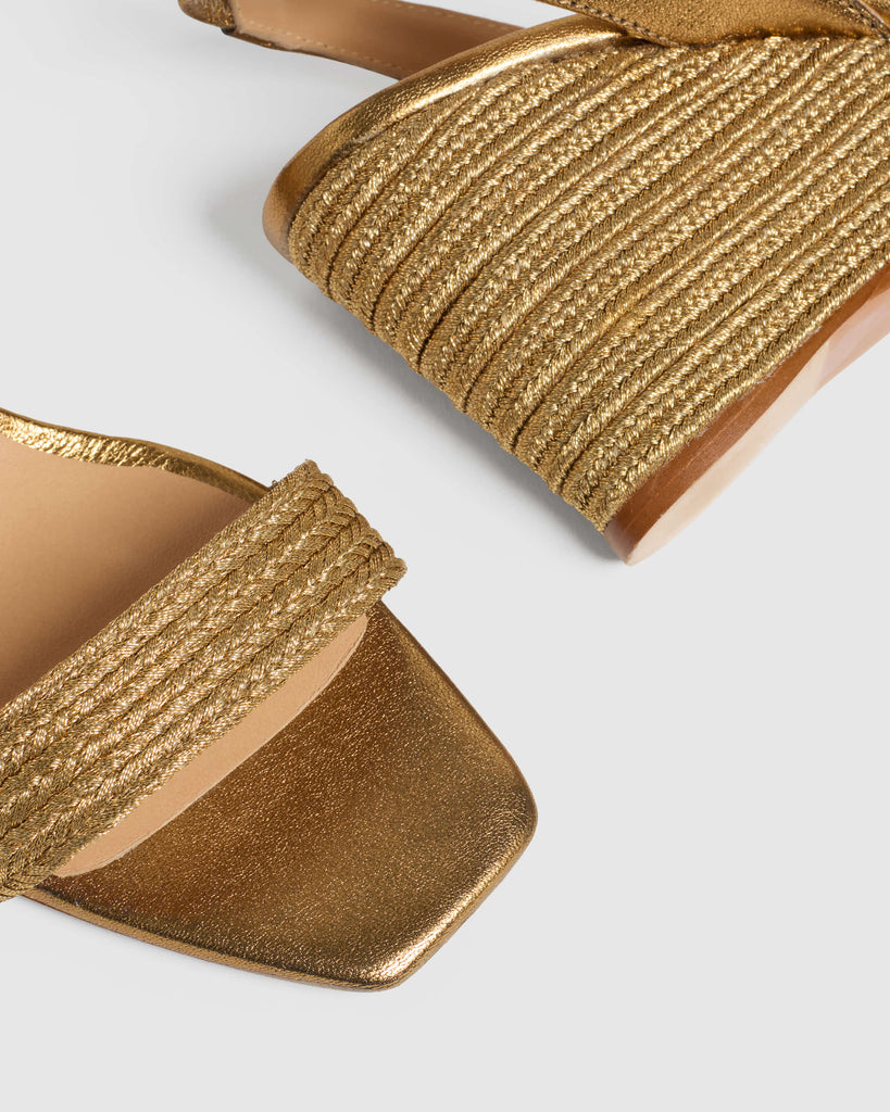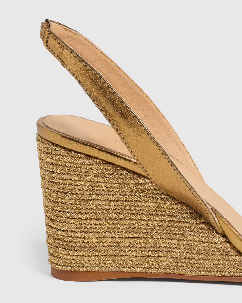 THE BARBY BRAIDED METALLIC SANDALS WILL ELEVATE ANY LOOK. HAND-MADE IN SPAIN, THE BARBY ESPADRILLES ARE A SURE THING. THEY FEATURE AN OPEN TOE, OPEN HEEL, 8 CM WEDGE AND CUEROLITE SOLE.