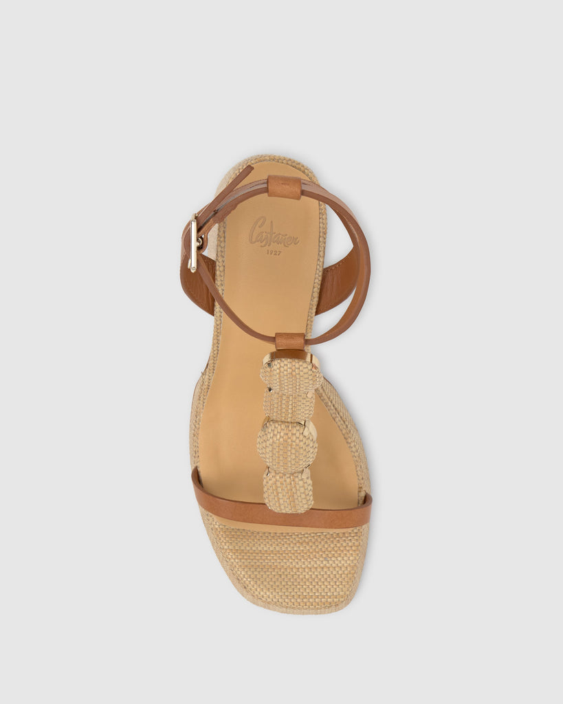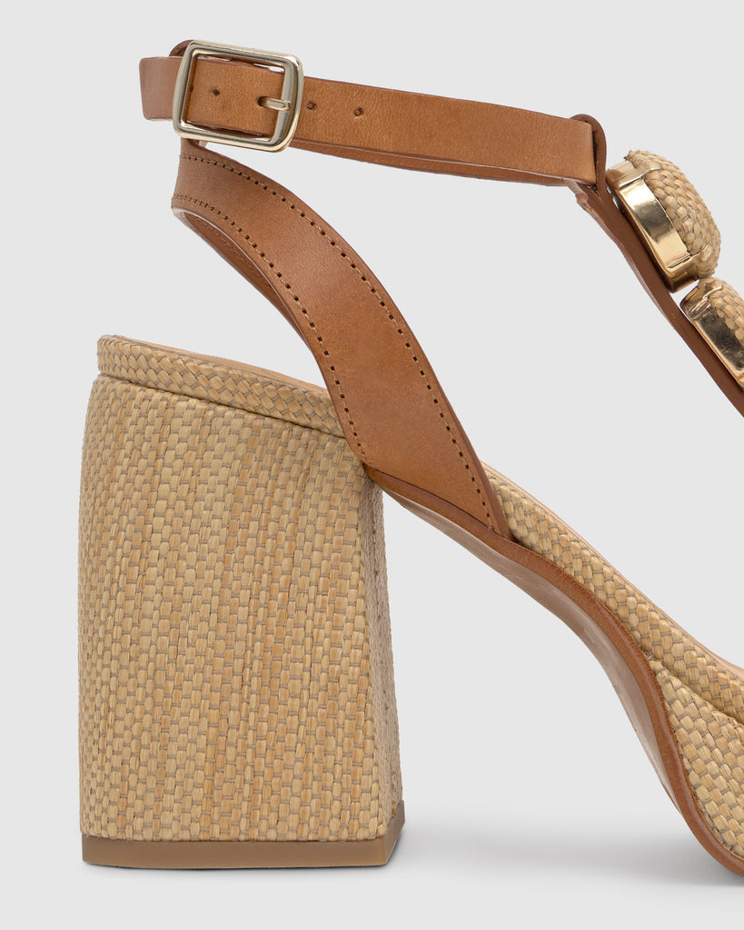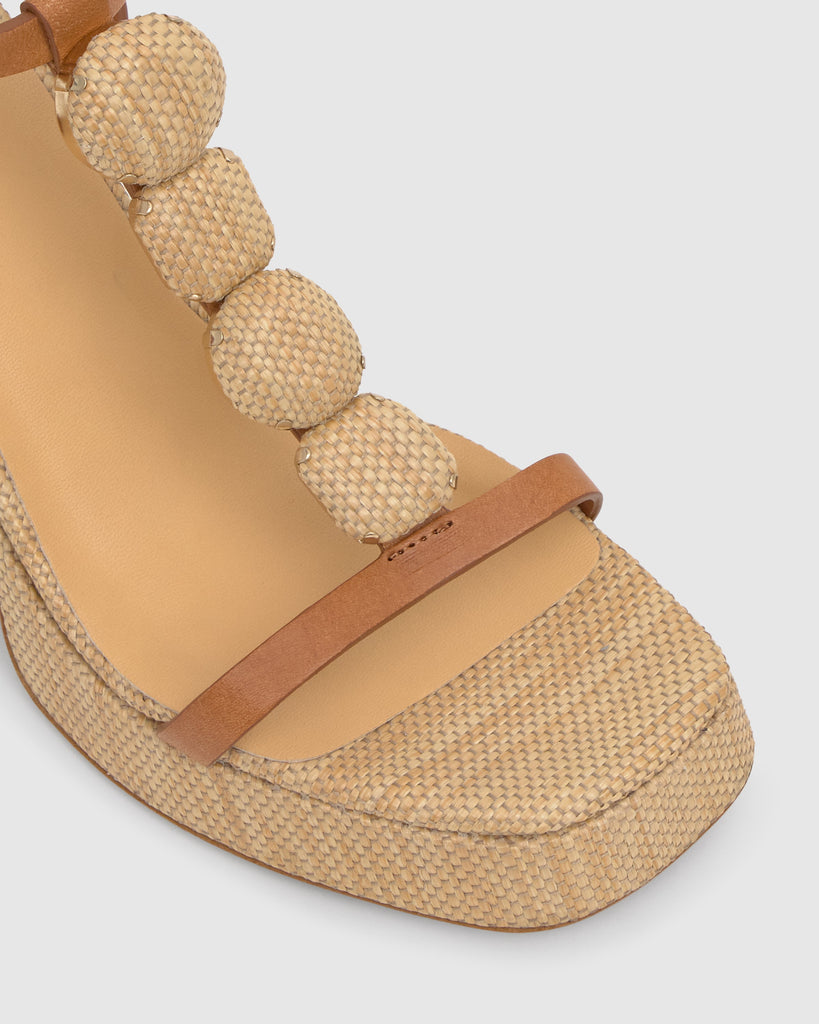Vitto napa leather sandal with raffia-lined trim, strap closure, padded insole, and 10cm heel.