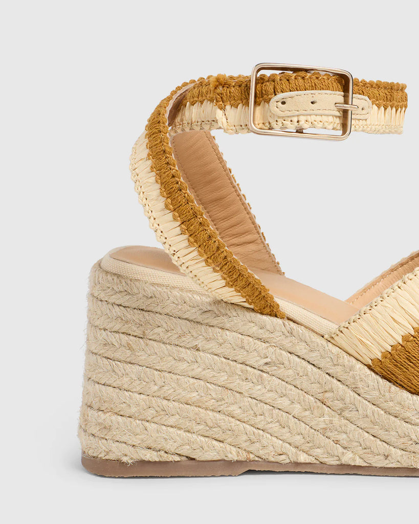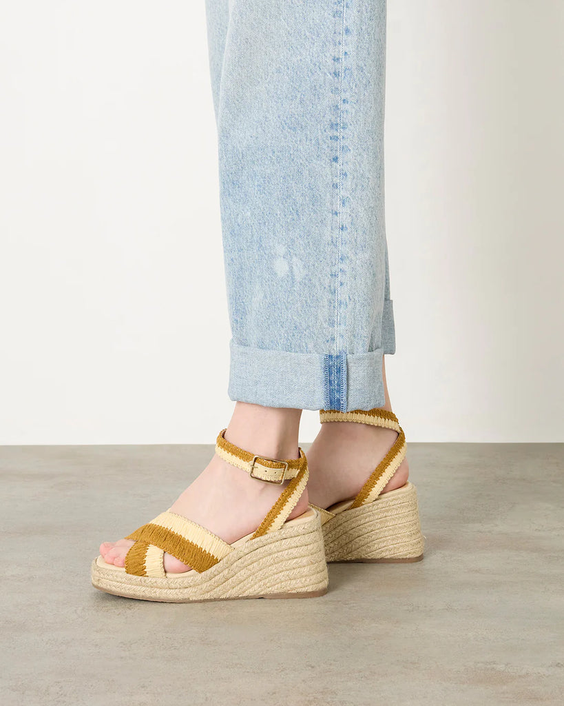 These shoes go with any summer outfit. The Tatiana sandals are made from a mix of cotton and raffia. They have an 8 cm wedge, buckle fastening and square toe. Our commitment to slow fashion for those sunny beach days.