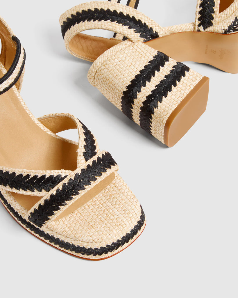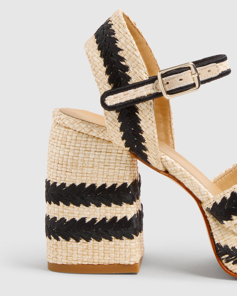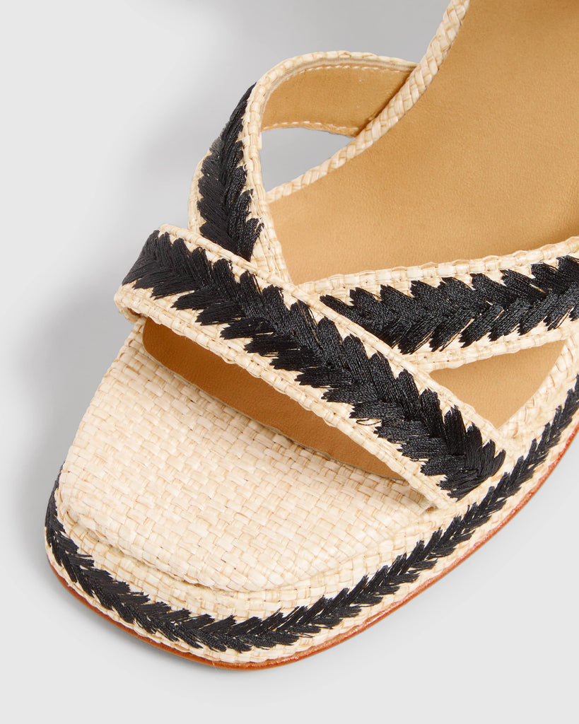CLASSIC SUMMER SANDALS WITH GORGEOUS EMBROIDERED COTTON ON RAFFIA. HAND-MADE IN SPAIN, THE VEGA SANDALS FEATURE A SQUARE OPEN TOE, ANKLE STRAP WITH METAL BUCKLE, OPEN HEEL, 10 CM HEEL AND CUEROLITE SOLE.