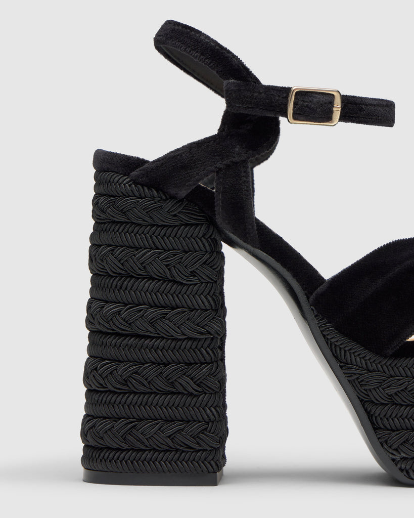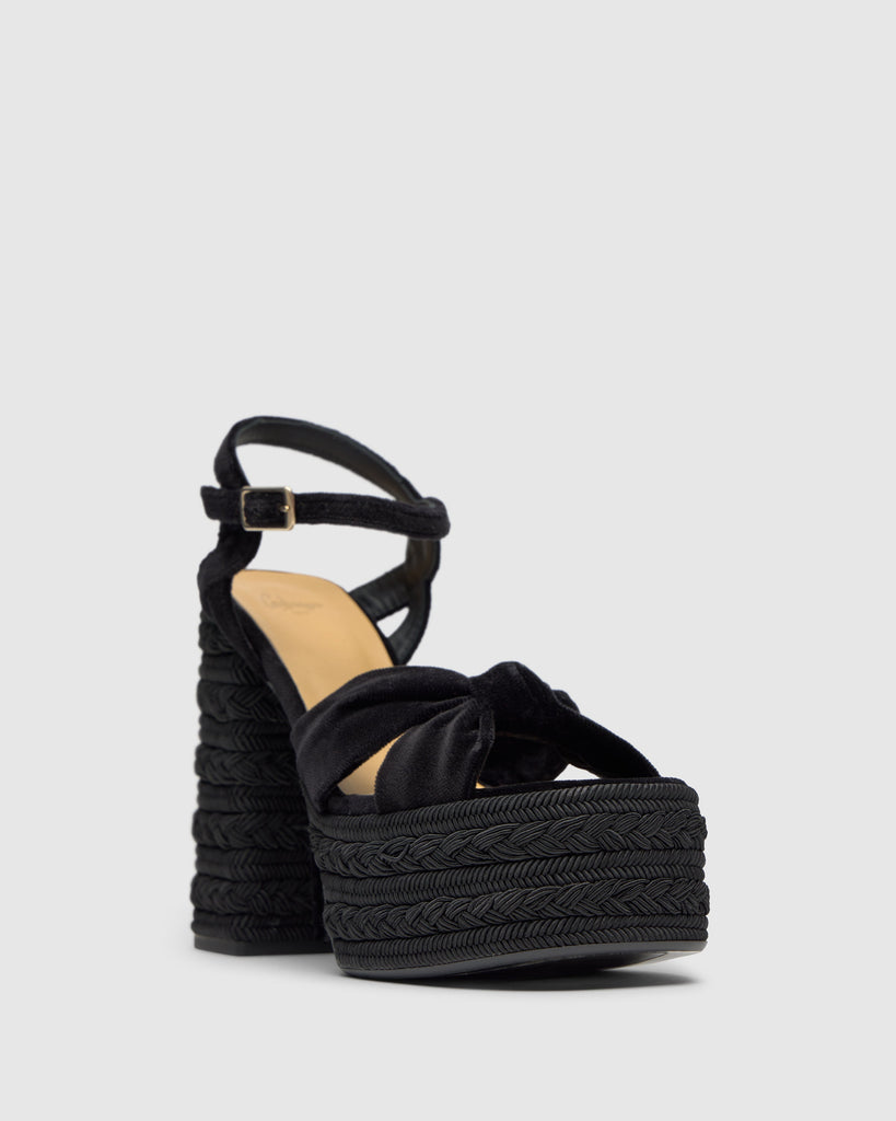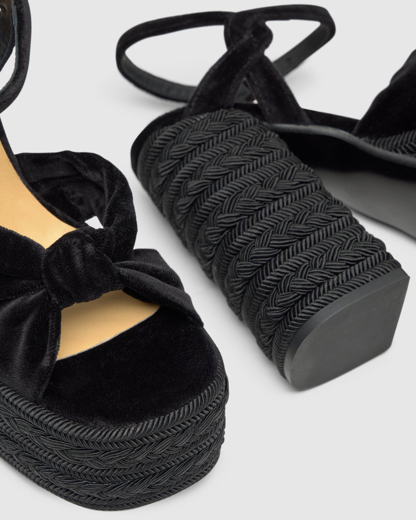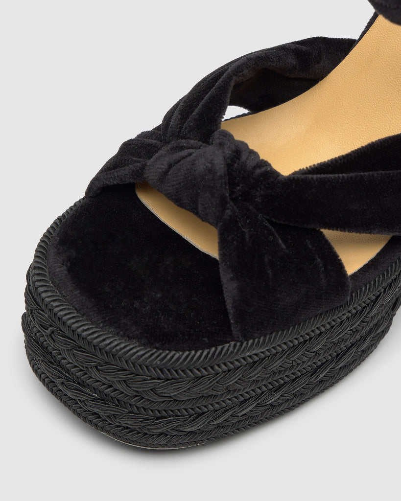 Fergy platform sandals in velvet. They feature a knot at the front and a buckle fastening. They stand out with their 13 cm heel and 5 cm platform.