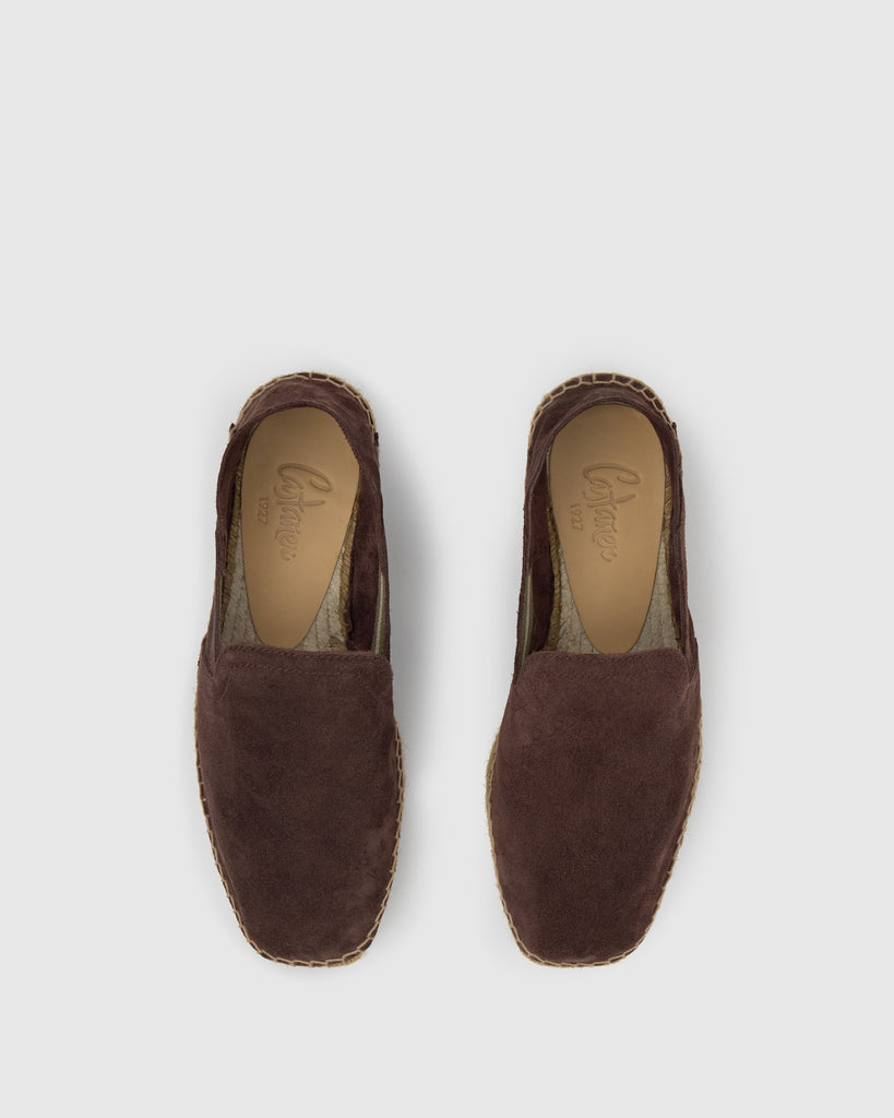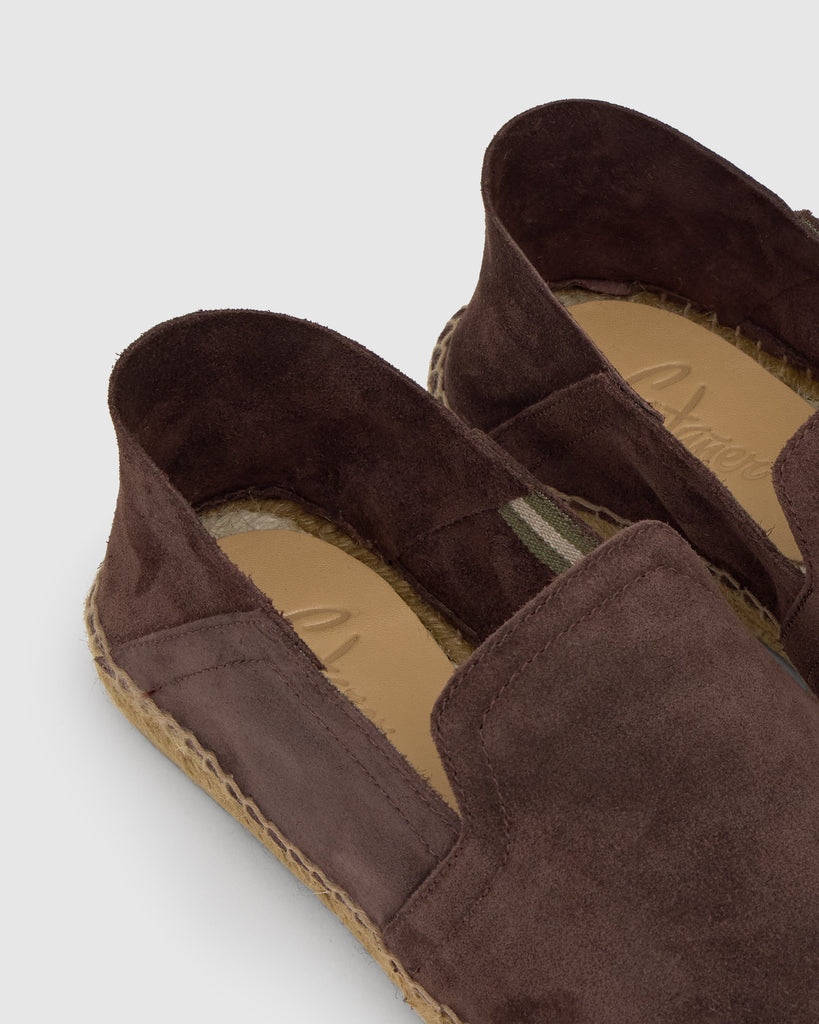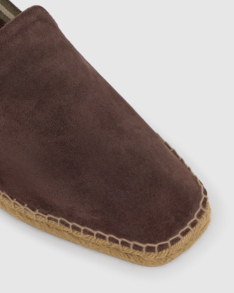 Parker slipper-style espadrille in suede with a walkable heel and taupe jute sole.