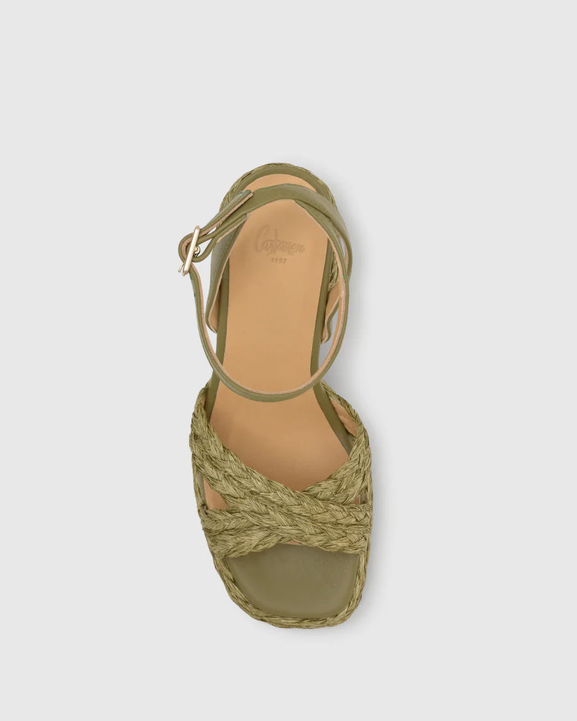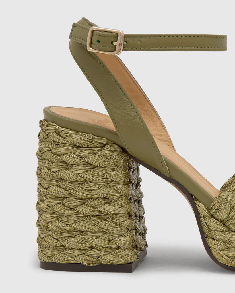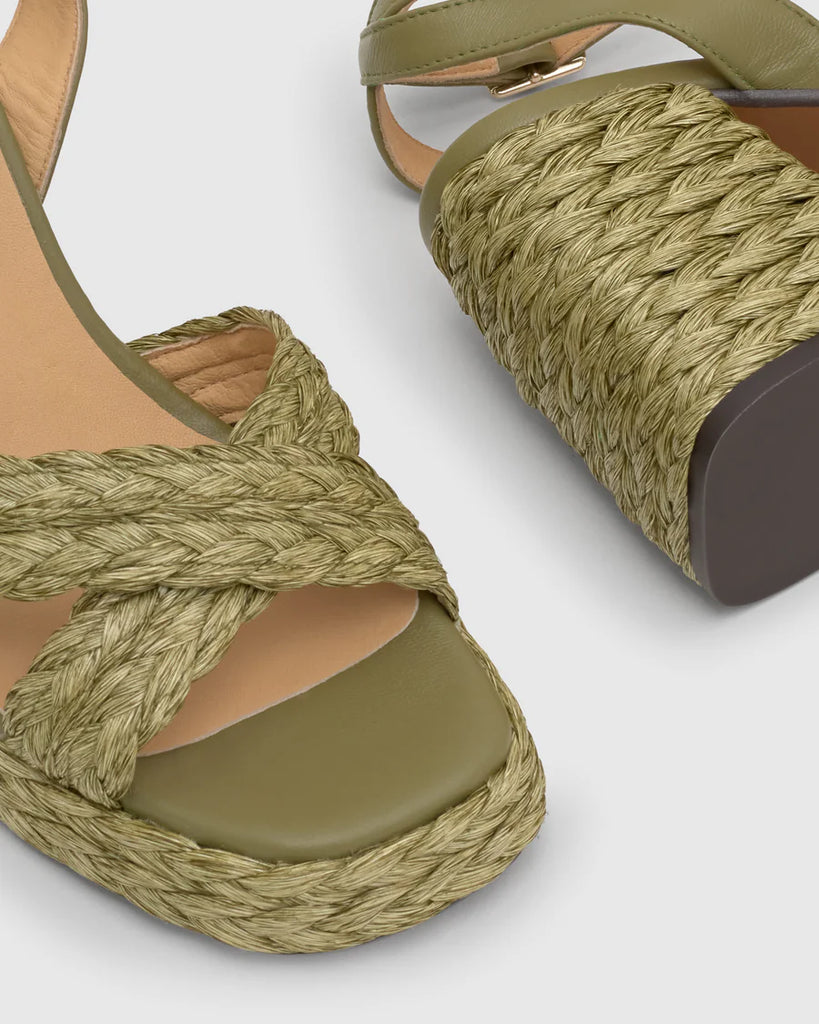 Valeriette sandal in natural raffia with buckle closure, cushioned insole, V-neck and 10cm heel with matching lining.